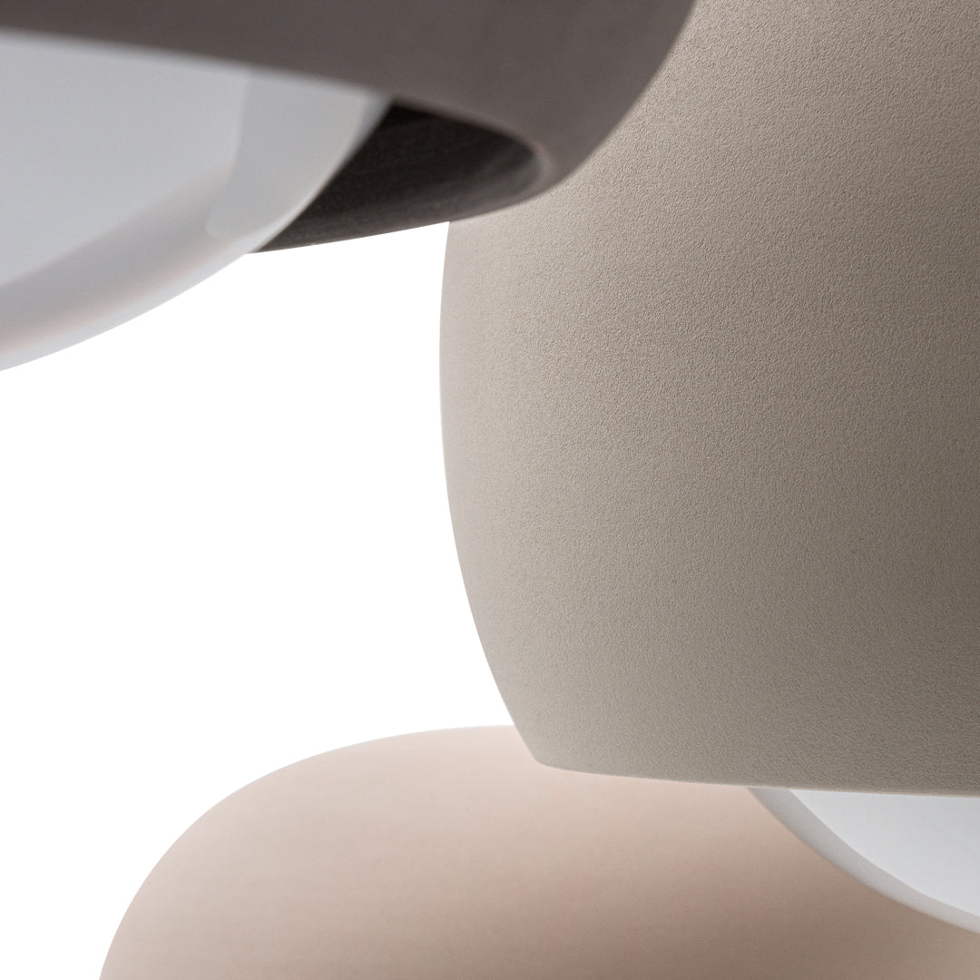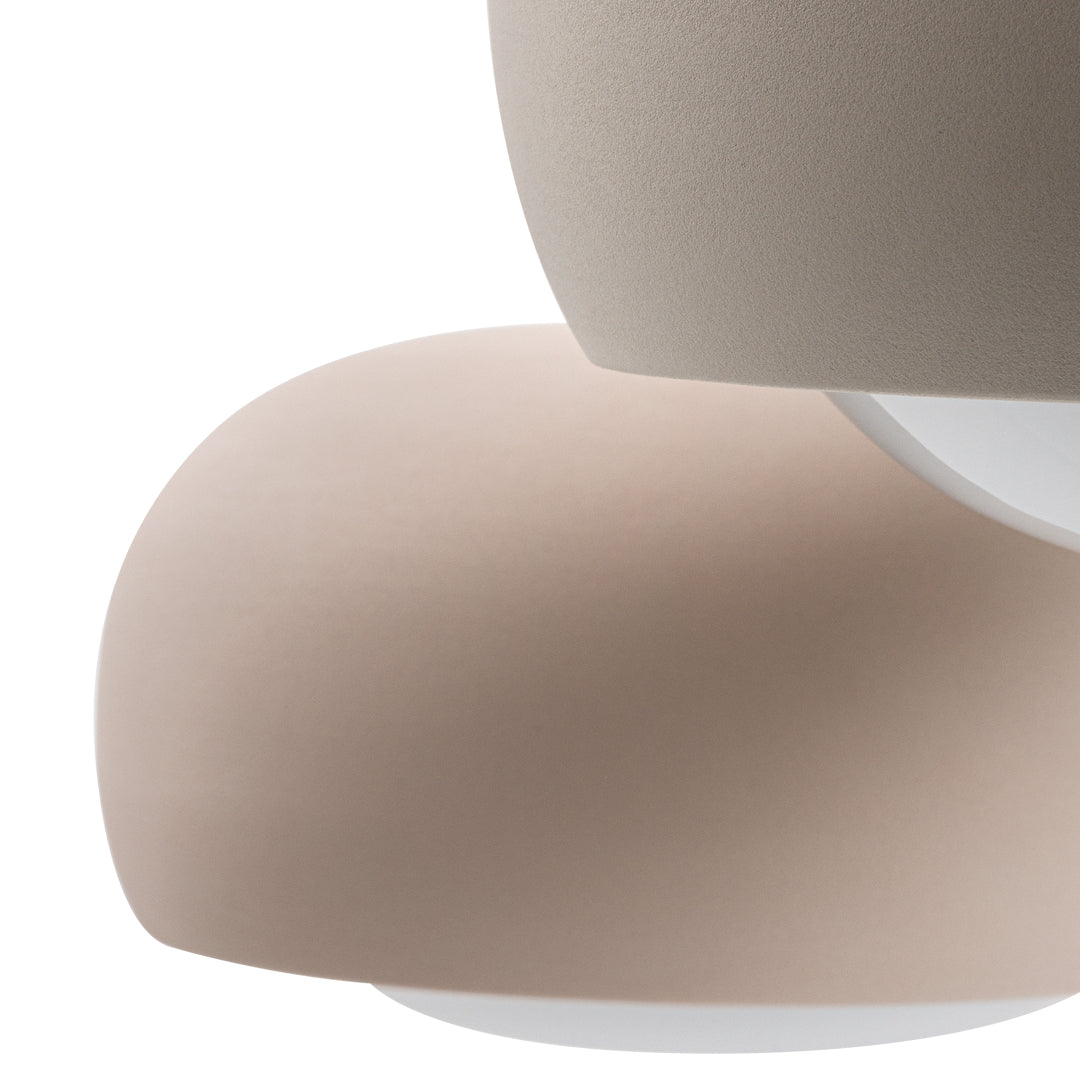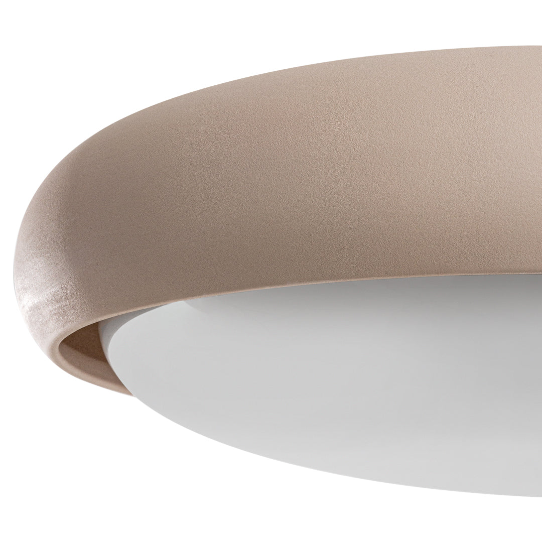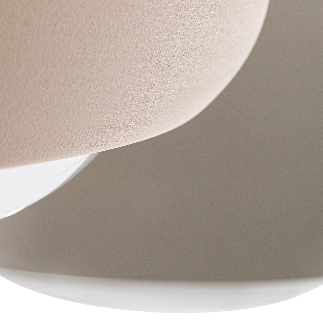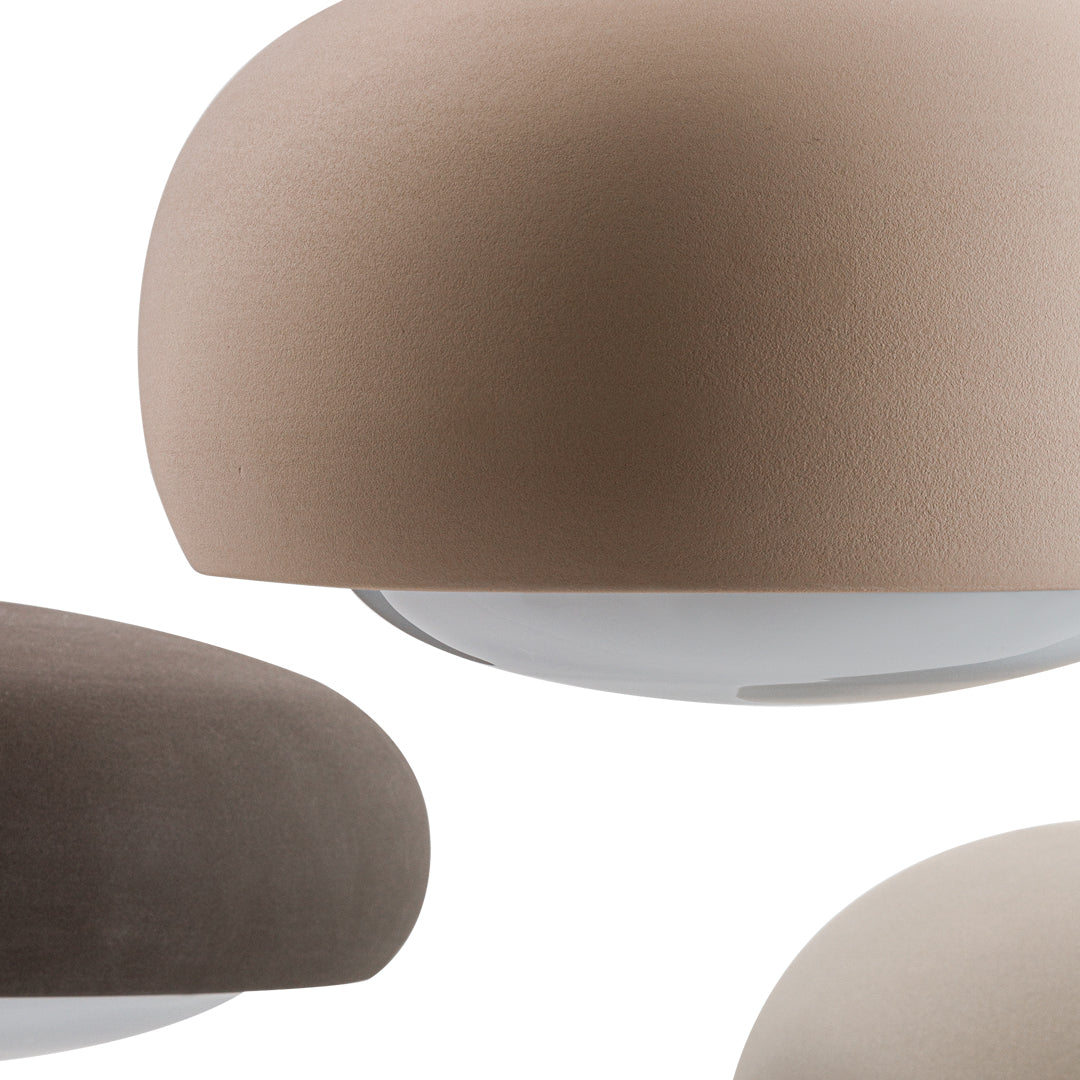 The shapely lampshade of the GEMA lighting family made of Engobe ceramic is available in the earth tones pale rose, sand and coal and three sizes. The surface is rough, as if dipped into sand. The Engobe ceramic colouring technique closes the open-pored surface of the ceramic, the process refines the clay.