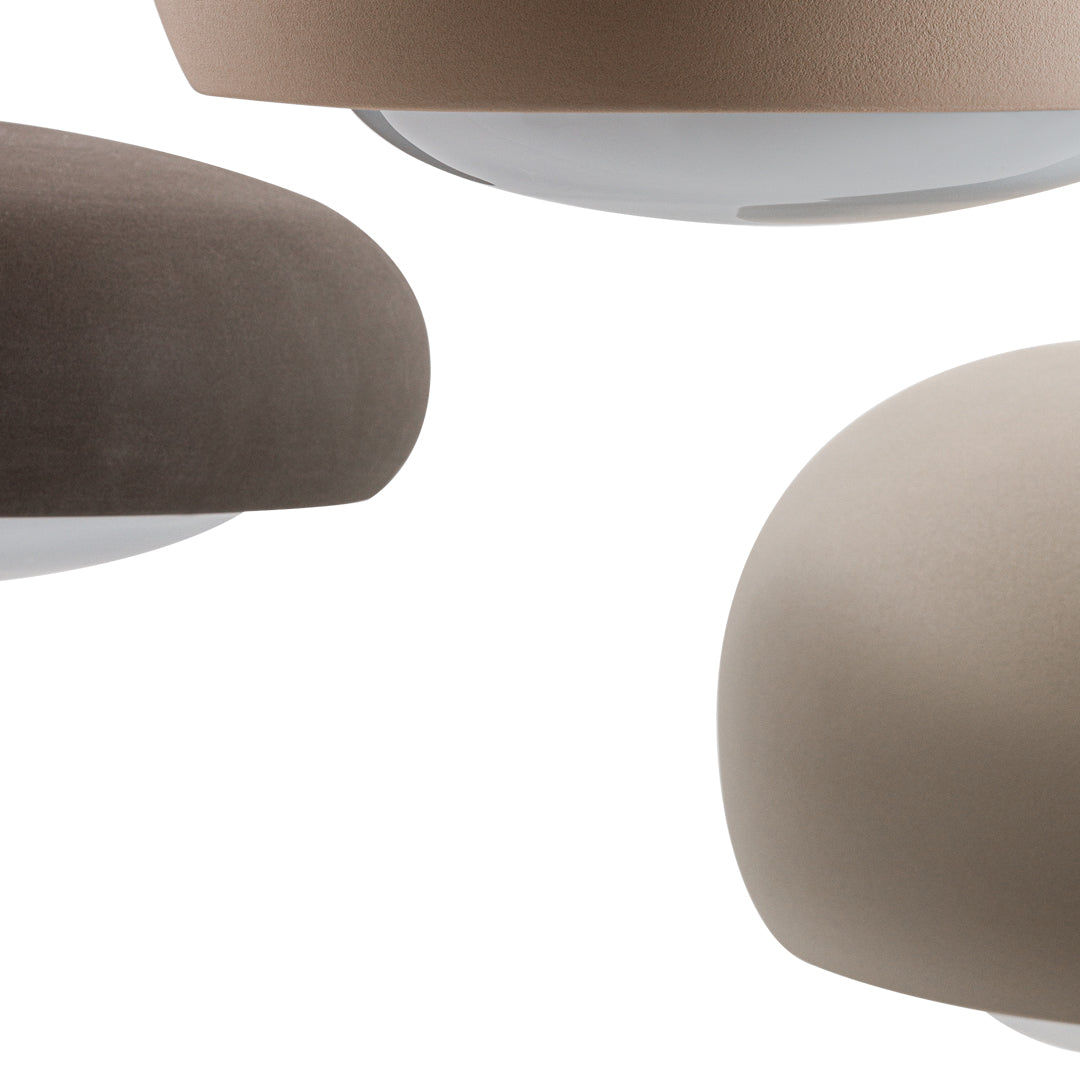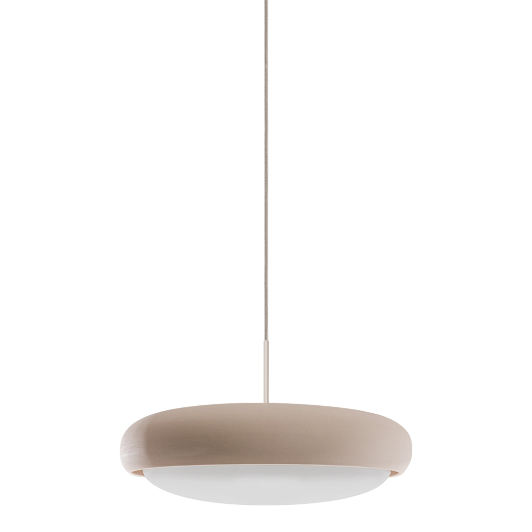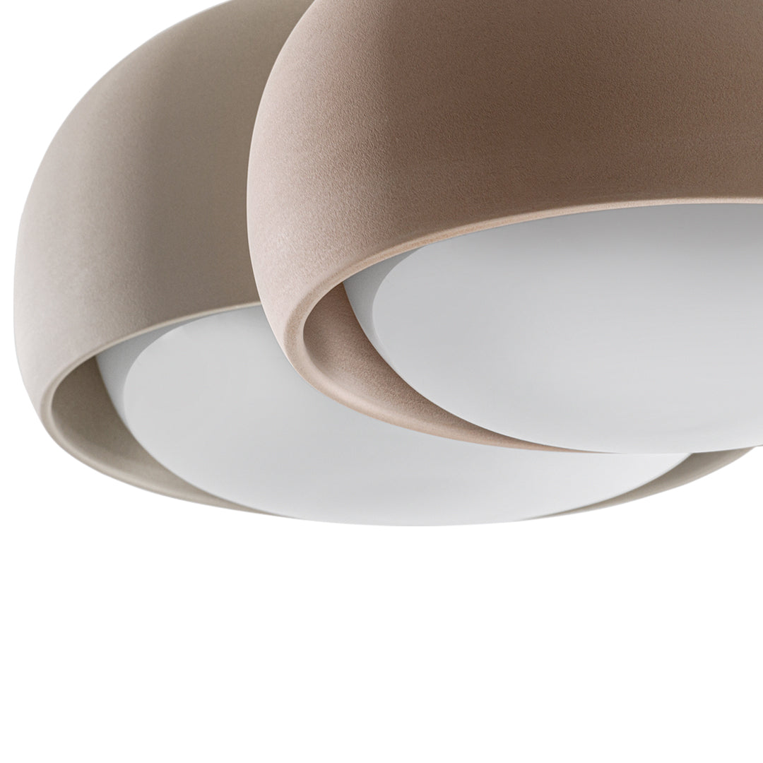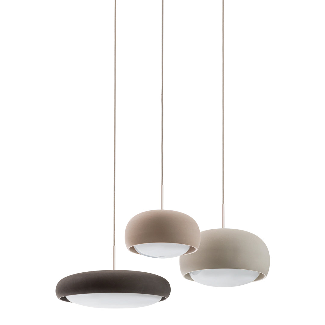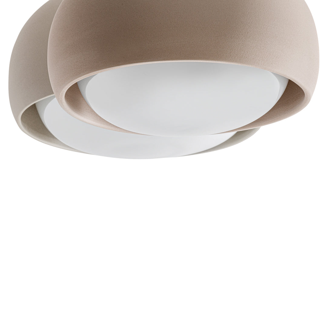 The shapely lampshade of the GEMA lighting family made of Engobe ceramic is available in the earth tones pale rose, sand and coal and three sizes. The surface is rough, as if dipped into sand. The Engobe ceramic colouring technique closes the open-pored surface of the ceramic, the process refines the clay.