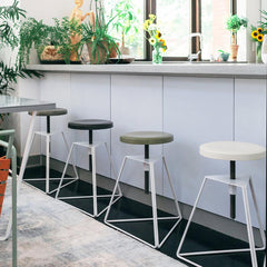 The Camp Stool is the contemporary embodiment of the classic piano stool. Its solid steel frame provides a sturdy foundation for the seat to spin and adjust to the perfect height for any occasion. Arrange a selection of different seat and frame options together to create a refined yet playful cohesive seating area. An optional backrest that provides just the right amount of support with a comfortable flex is also available.