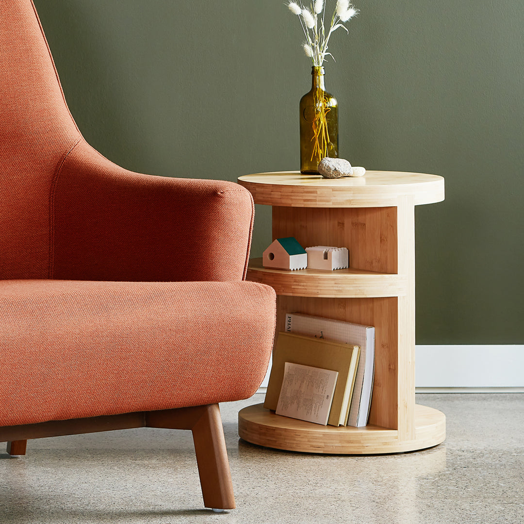 The Monument End Table ticks all the boxes of contemporary modern style with its sculptural, functional, and sustainable approach to design. This versatile, handsome accent can be nested with sofas and coffee tables or be used as an end table or stool according to your needs. Stylishly integrated shelves provide a way to keep all the essentials – from phones to remotes – neatly tucked away, yet within reach. The warm tiled grain of sustainable bamboo plywood adds organic, visual dimension while seamlessly complementing the visible joinery.