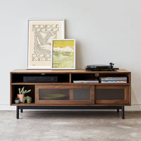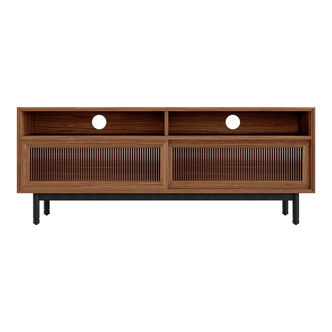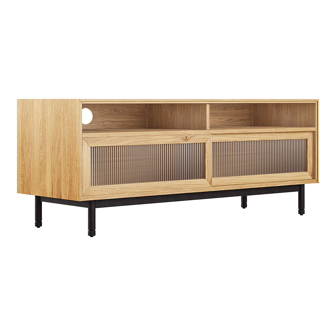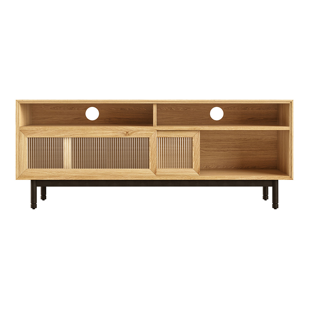 Features 2 doors with 1/4" fluted glass inlay, surrounded by solid wood frames. Sliding doors reveal 2 storage compartments. Smooth gliding doors run on an aluminum track and can be positioned for convenient access and concealment with the aid of magnetic closures. 2 concealed openings in back panel for cable management.