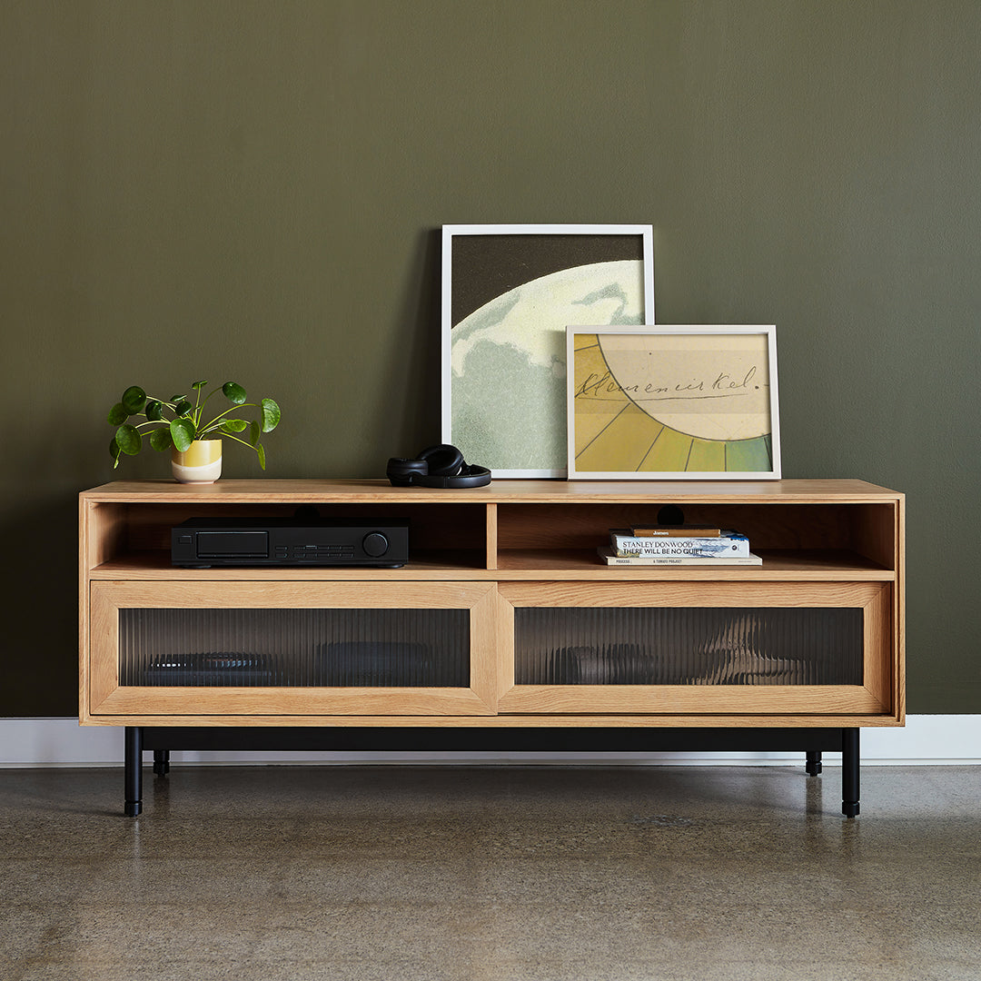 Our bespoke Munro Media Stand is the ideal platform for your television, record player or media consoles. Sliding, fluted glass doors allow you to admire what’s within while maintaining an air of mystery. Back panel openings for cable management mean that you can showcase your hi-fi components without displaying unsightly mess. Choose from Walnut or Oak, each with a Zero‐VOC, hand‐rubbed matte finish, thoughtfully selected to highlight the unique, organic beauty of the wood grain. Solid wood edge details and solid steel legs mean that this media stand is built to last – a good thing because Munro’s classic, minimalist ethos will never go out of style.