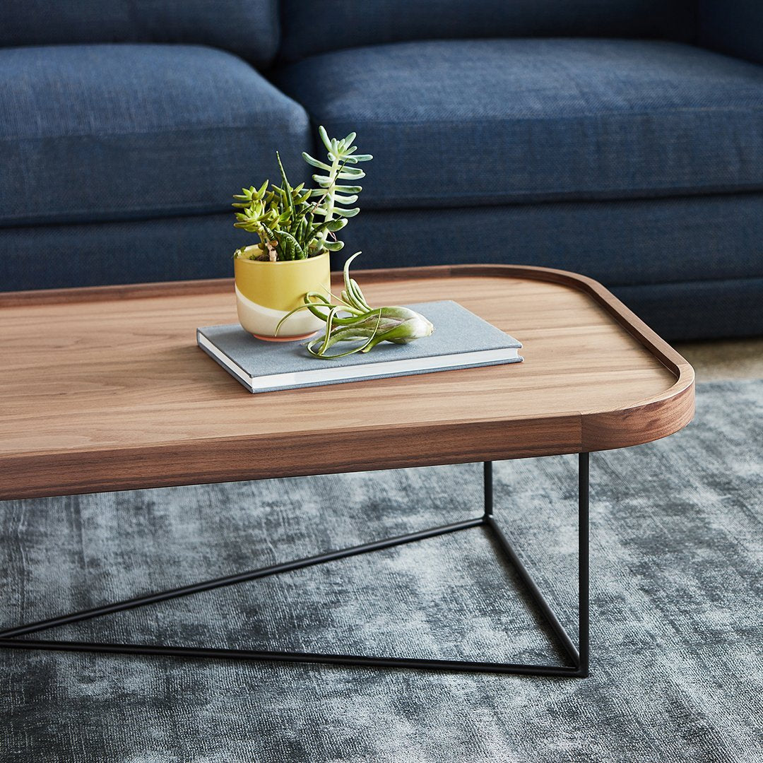 The Rectangular Porter Coffee Table offers an expansive, low-profile surface with refined, modern elements. It features a veneered wood top and a raised, solid wood edge detail with rounded corners. The eye-catching base features an architectural arrangement of two, powder-coated metal triangles. Part of the Porter Series, it is designed to nest with the Porter End Table.