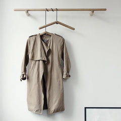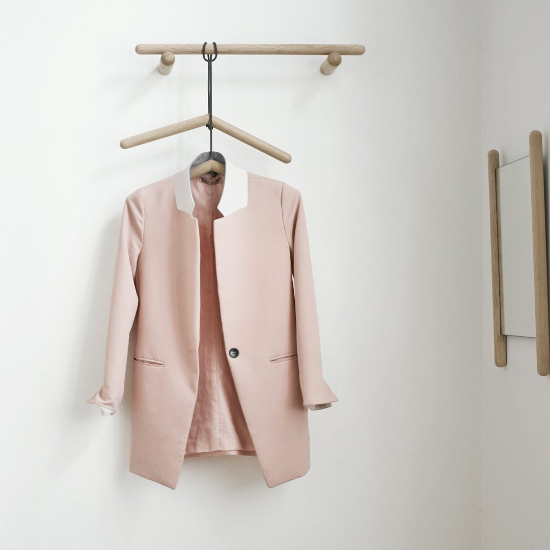 Wooden poles form the basic DNA in Chris L. Halstrom's Georg collection. Here, in a set-up reminiscent of a curtain rod, the pole serves as a coat rack. In materials and design, the accompanying hangers with leather straps reinterpret the genre.