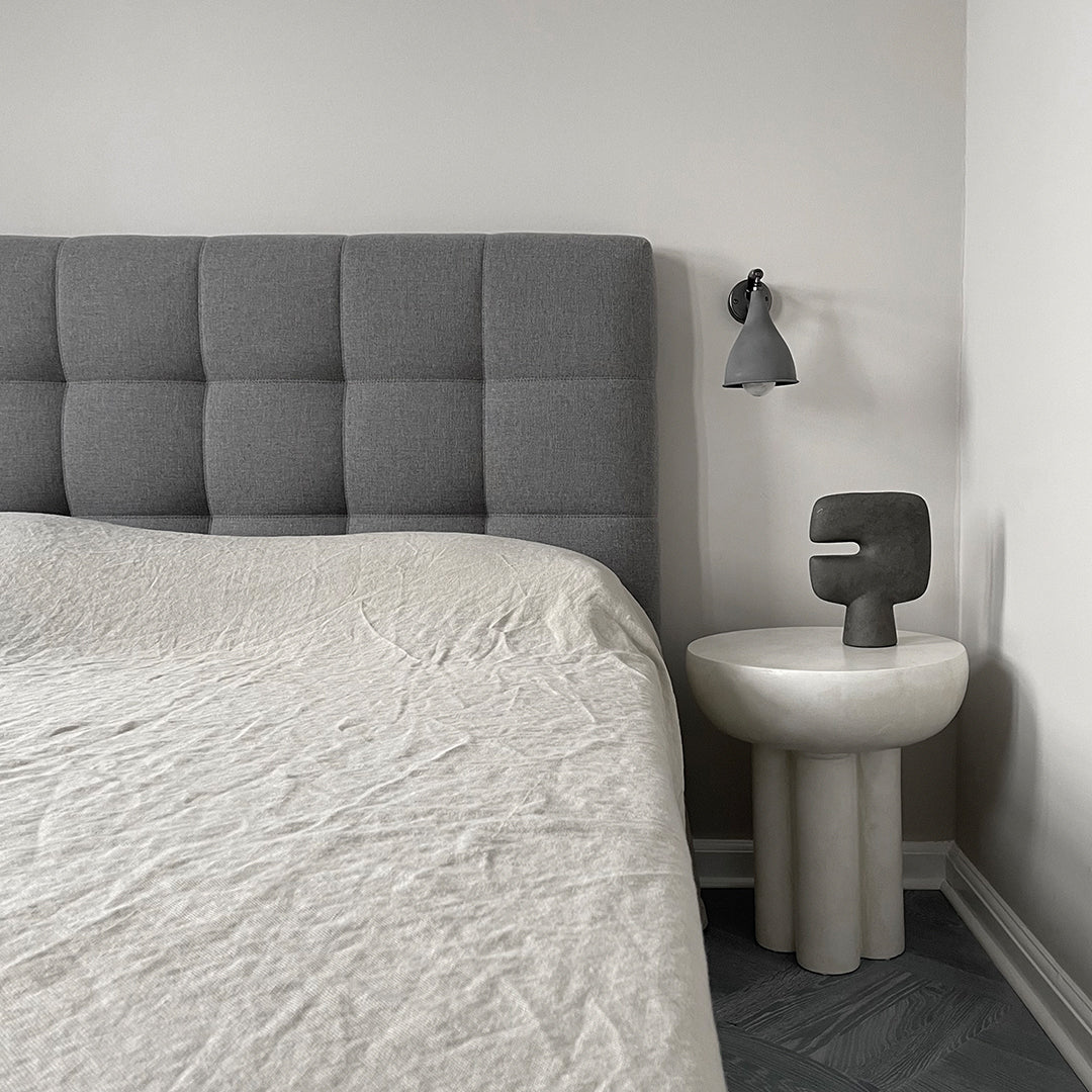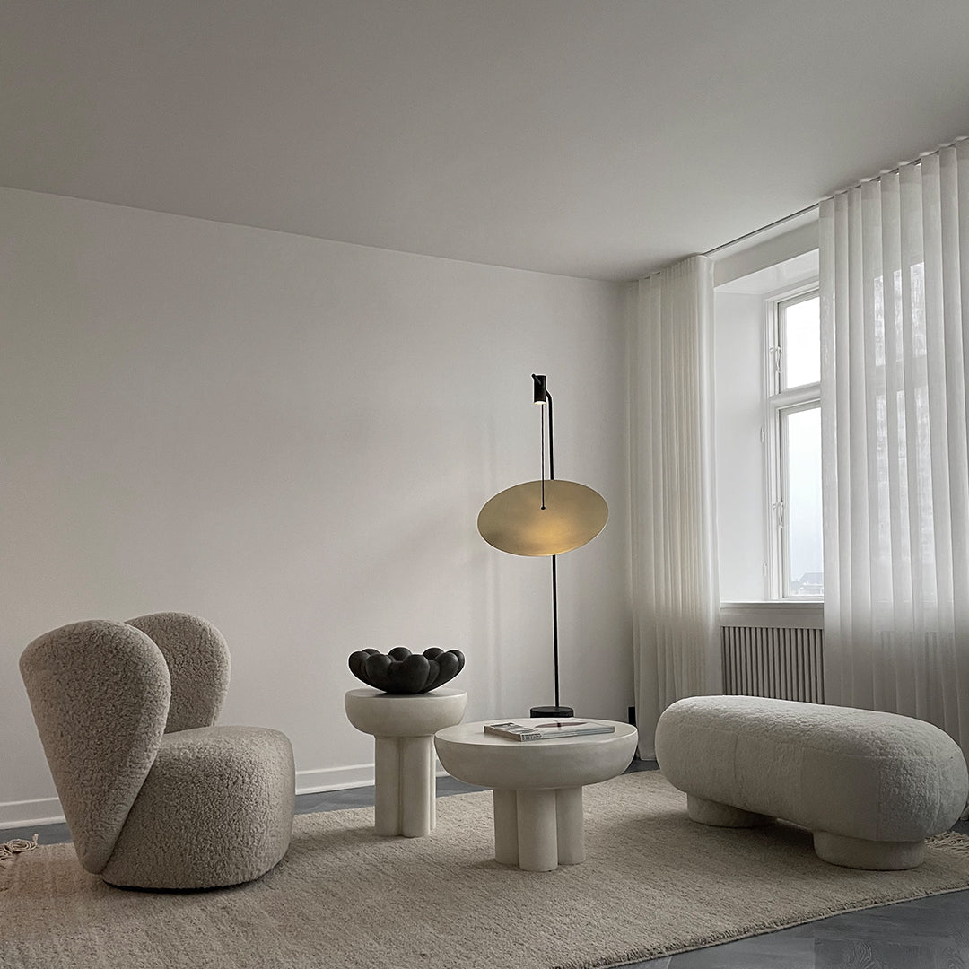 The collection of tables entitled Crown are cast in one piece formed as a circular table top carried by four cylinder shaped legs. Standing strong and proud, the table is inspired by the bare, structural elements of Brutalist architecture, celebrating the columns, and eluding an attitude towards too many details. The chunky fiber concrete legs enable a large gap between the table edge and legs to emphasize the experience of a massive floating table top. The table is available in two sizes and can be used as a single standing side table or stand together as a pair of coffee tables. Designed by Kristian Sofus Hansen; Tommy Hyldahl.
