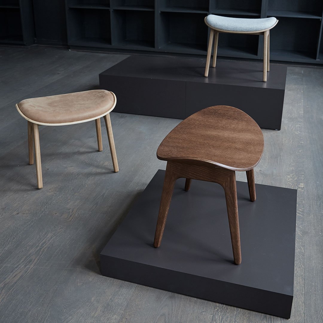 Elephant Stool comes with a seat of moulded oak veneer, resting on a wooden base of massive oak. The stool is available without upholstery as well as with different upholstery options.