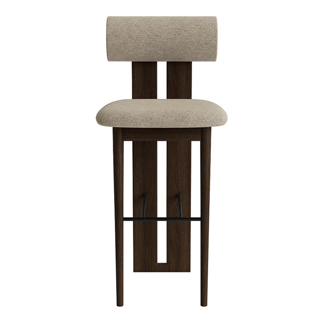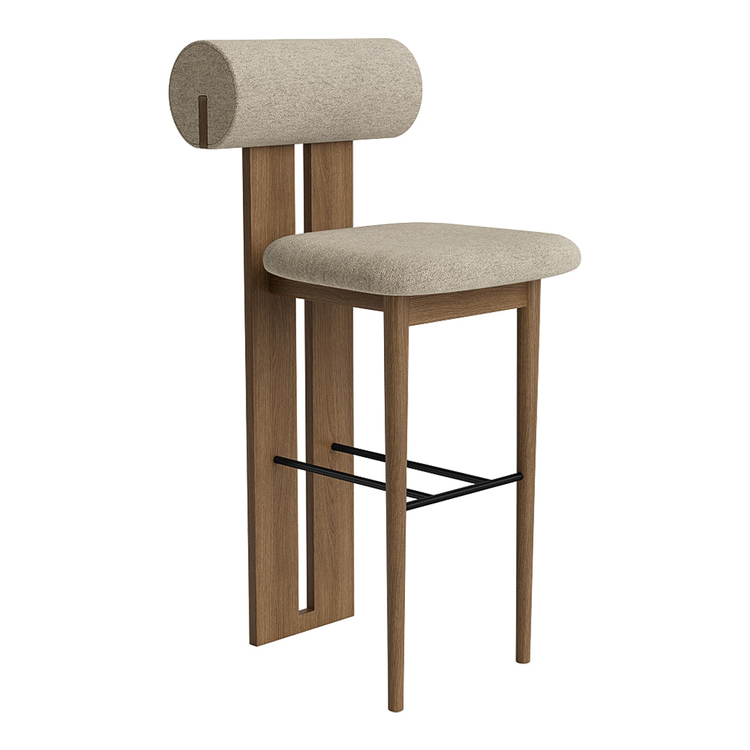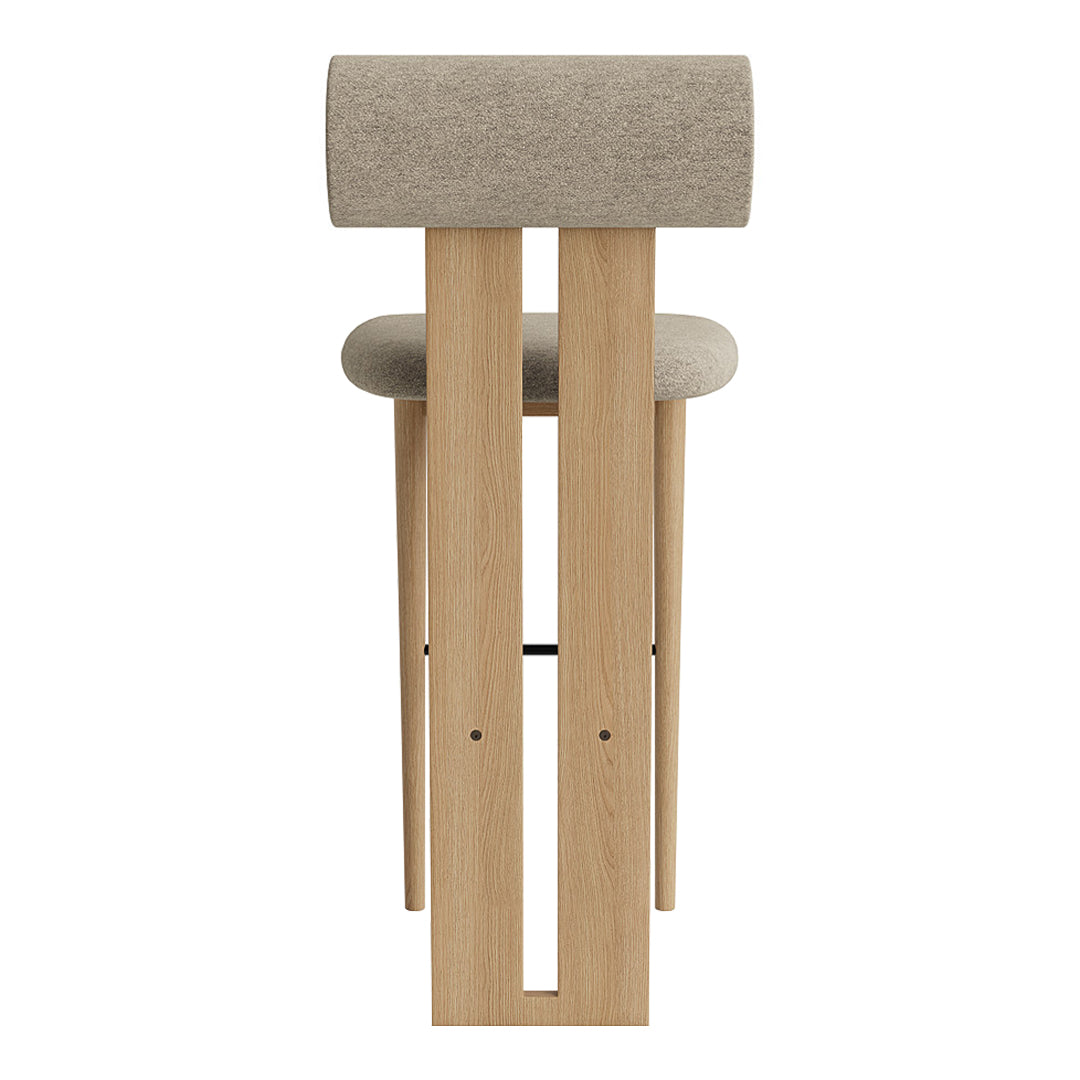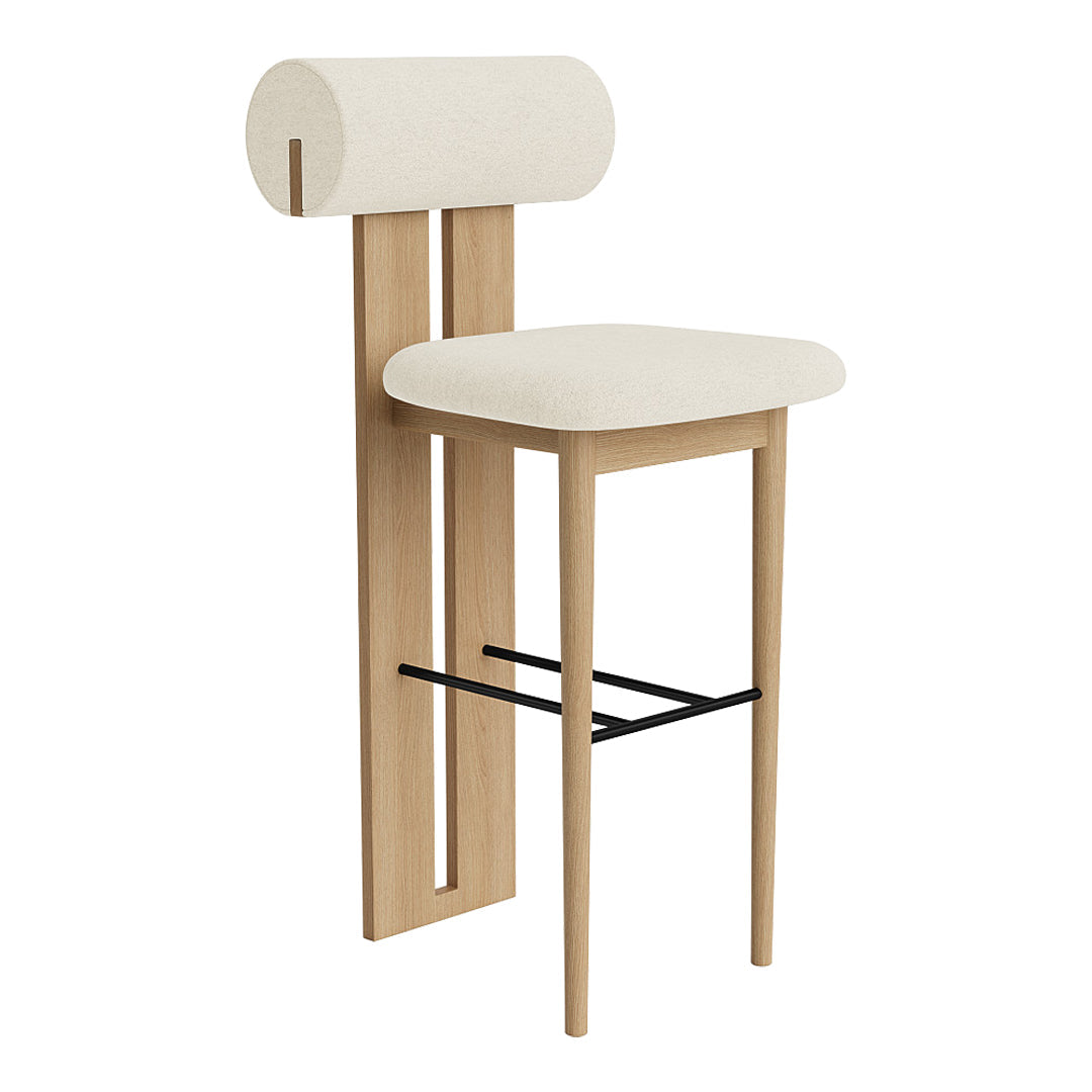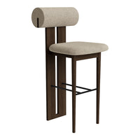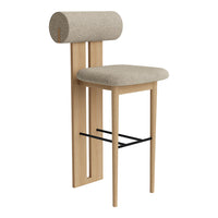 Soft, playful shapes characterize this family of upholstered pieces. Resting on two sturdy wooden legs and seamlessly connecting the seat and back, the Hippo Counter Chair is a counter version of the iconic Hippo Chair. The distinctive wooden profile acts as an almost architectural element that starkly contrasts with the rounded, soft back and seat. The iron footrest provides extra comfort.