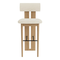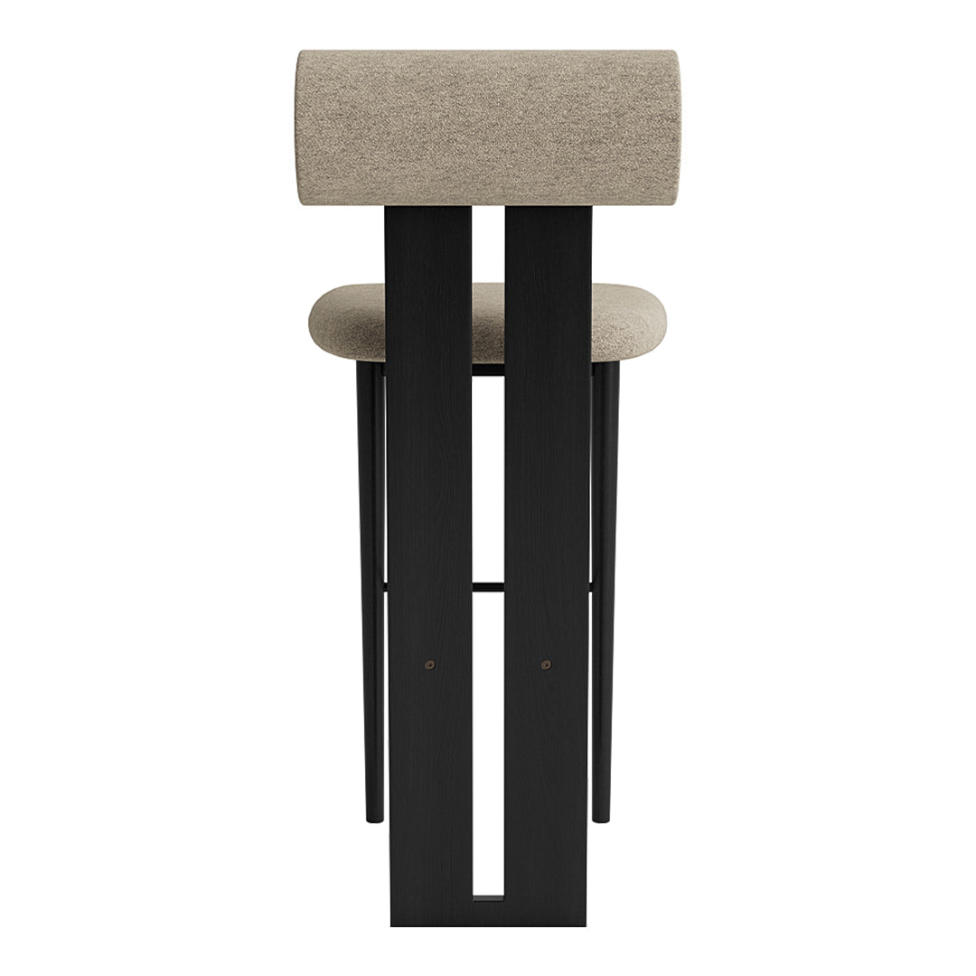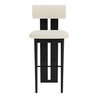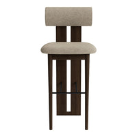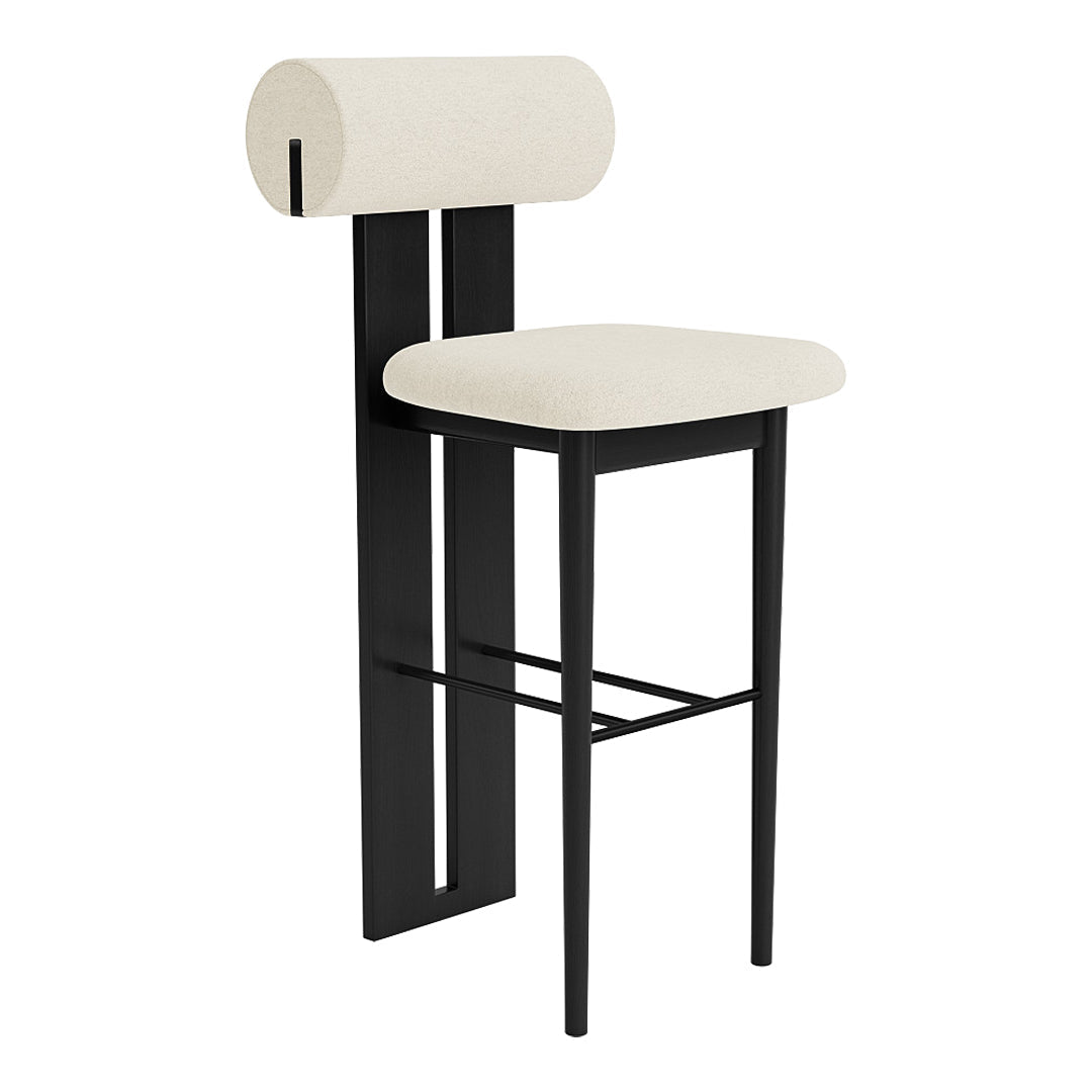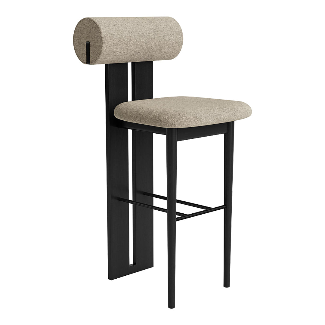 Soft, playful shapes characterize this family of upholstered pieces. Resting on two sturdy wooden legs and seamlessly connecting the seat and back, the Hippo Counter Chair is a counter version of the iconic Hippo Chair. The distinctive wooden profile acts as an almost architectural element that starkly contrasts with the rounded, soft back and seat. The iron footrest provides extra comfort.