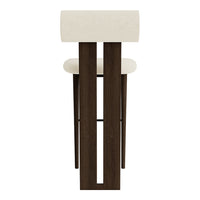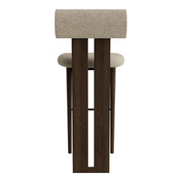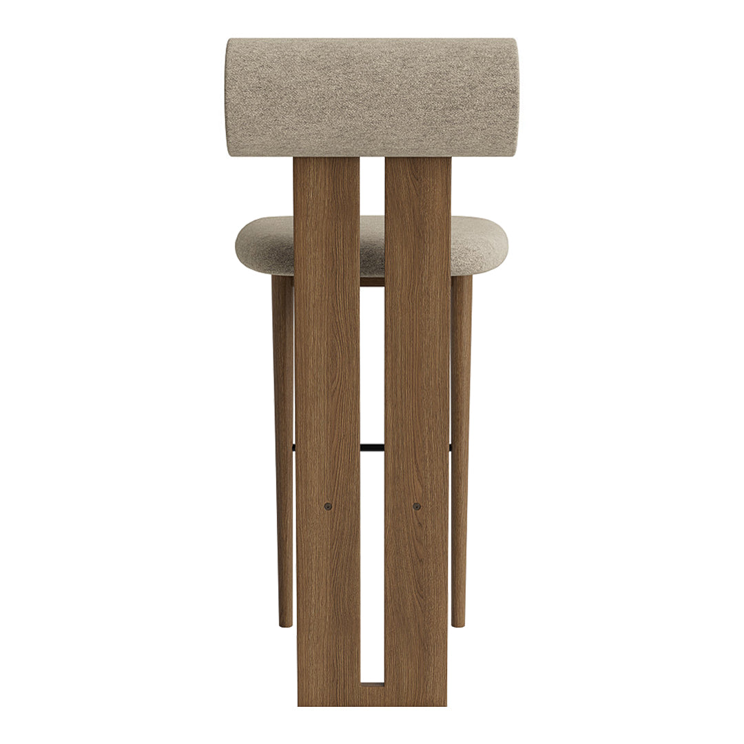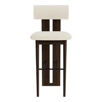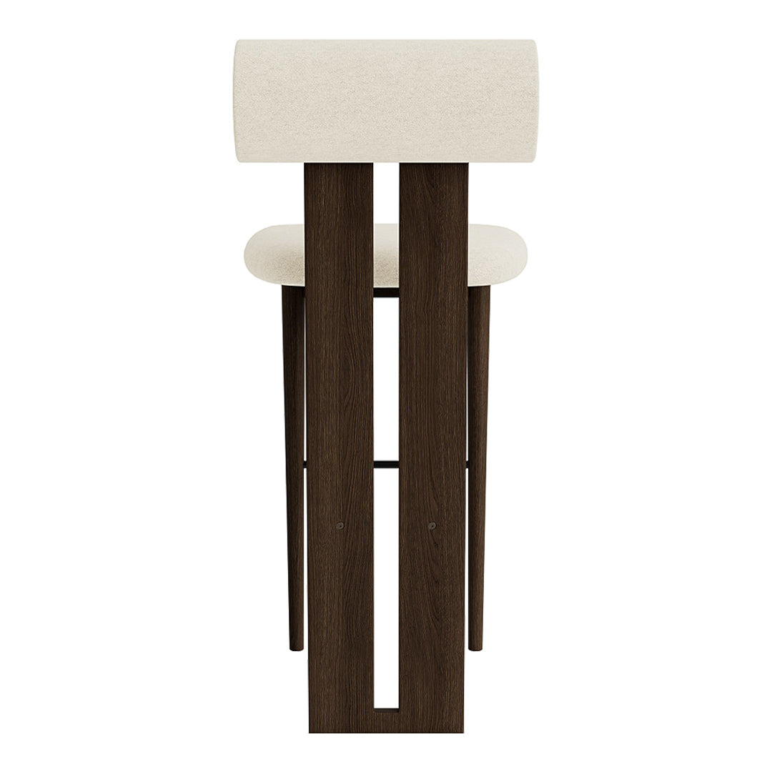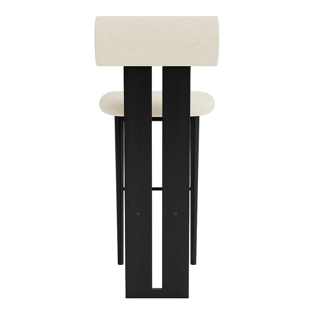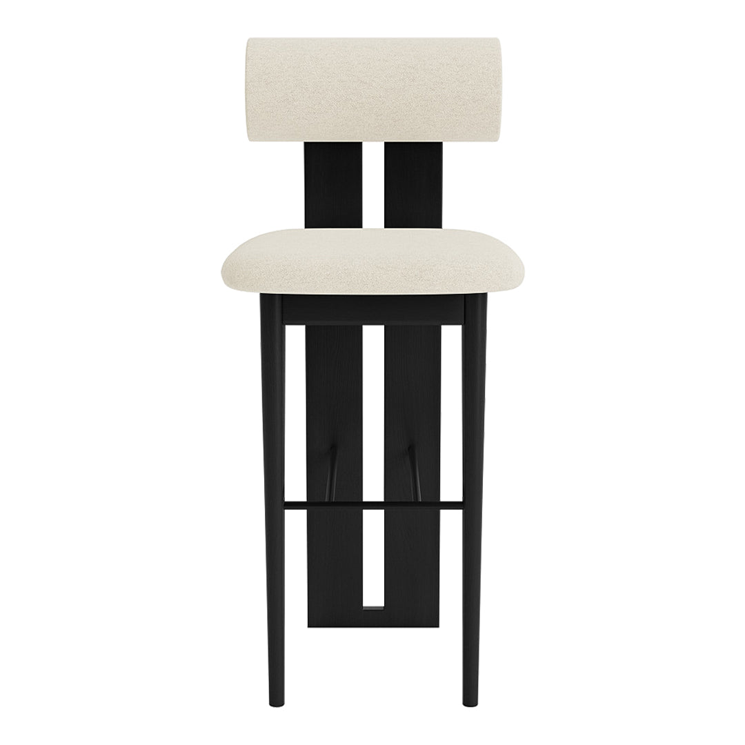 Soft, playful shapes characterize this family of upholstered pieces. Resting on two sturdy wooden legs and seamlessly connecting the seat and back, the Hippo Counter Chair is a counter version of the iconic Hippo Chair. The distinctive wooden profile acts as an almost architectural element that starkly contrasts with the rounded, soft back and seat. The iron footrest provides extra comfort.