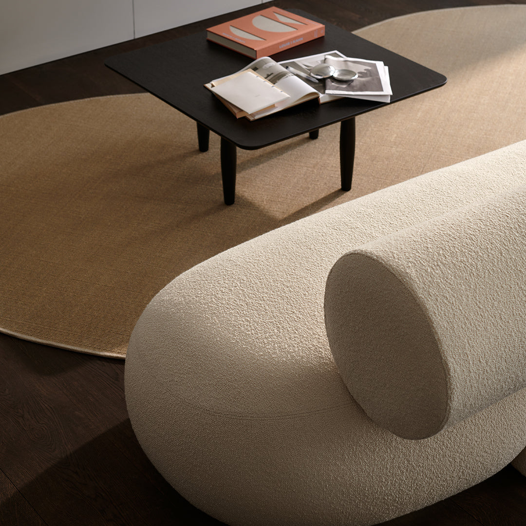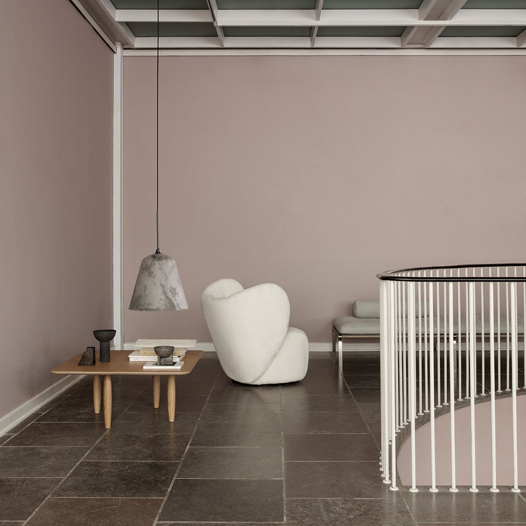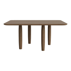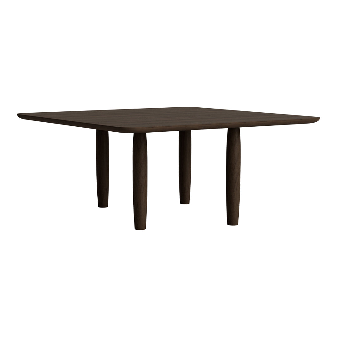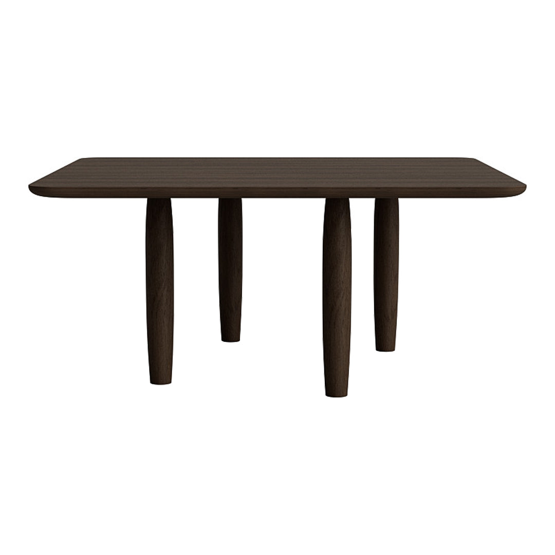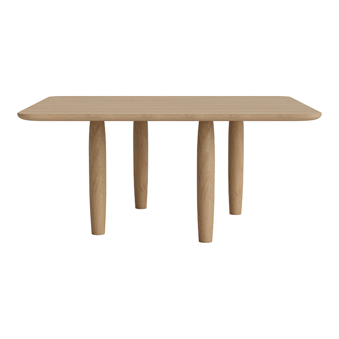 The Oku table top is produced in oak veneer with round edges, adding a refined detail to the large surface. The legs of turned oak timber sections, is positioned sporadically to create the illusion of a floating table top, while also adding a sculptural detail to the table.