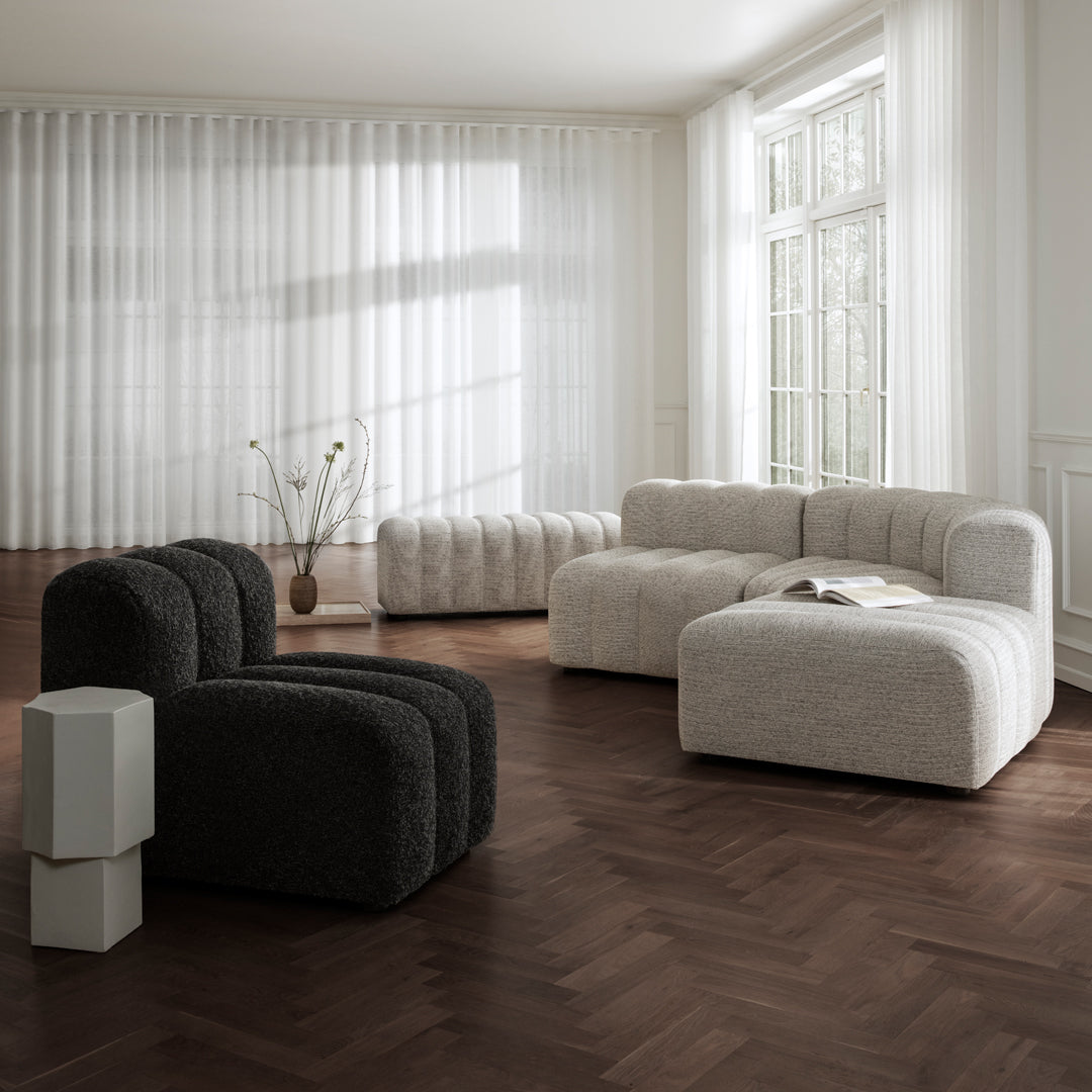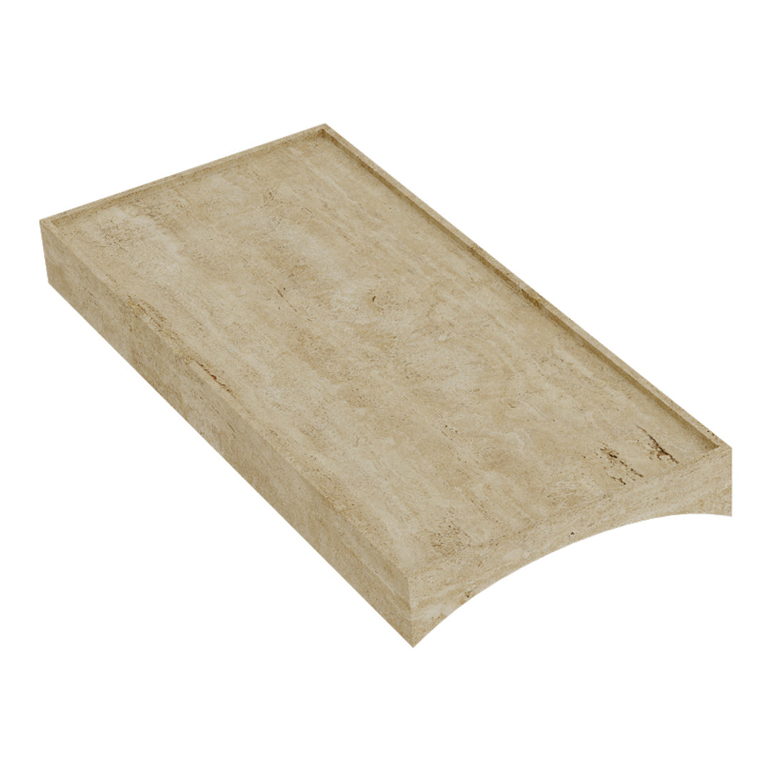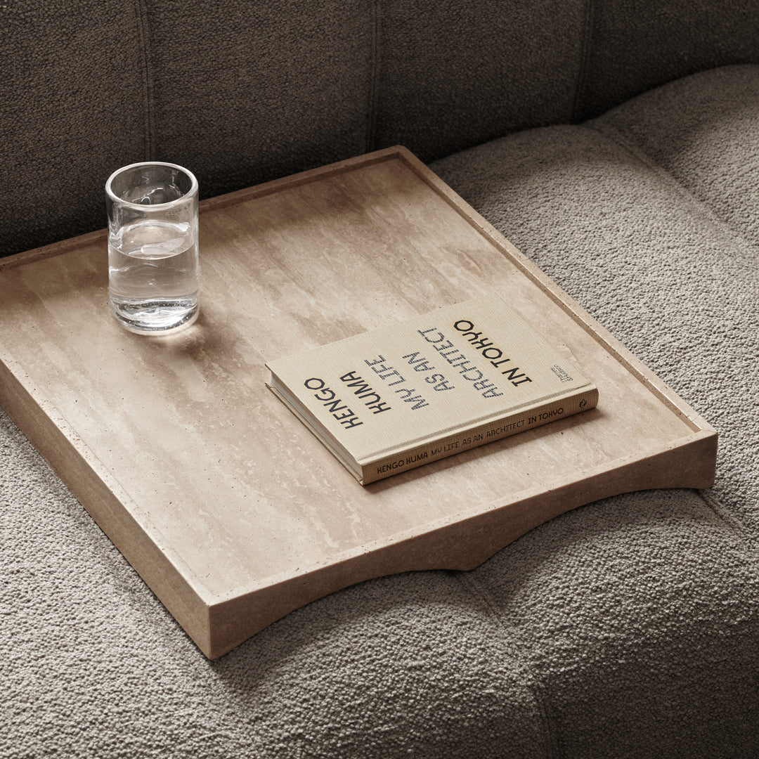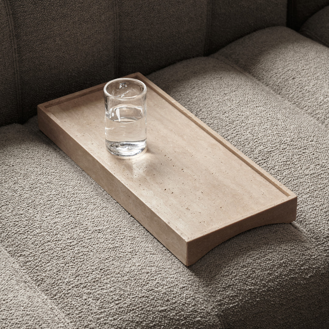 Studio Tray is a functional and refined tray, designed to perfectly complement the Studio sofa. The tray comes in two different sizes and is made of travertine, offering a beautiful contrast to the Studio's soft shapes and fluted upholstery.