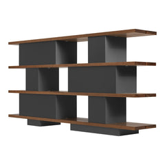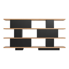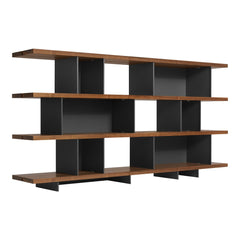 Wood shelves and metal blocks stack without the need for hardware forming beautiful voids and cubbies to house all the things in a perfectly curated manner. Two widths of foot and shelf blocks celebrate asymmetry while bringing stability and visual appeal.