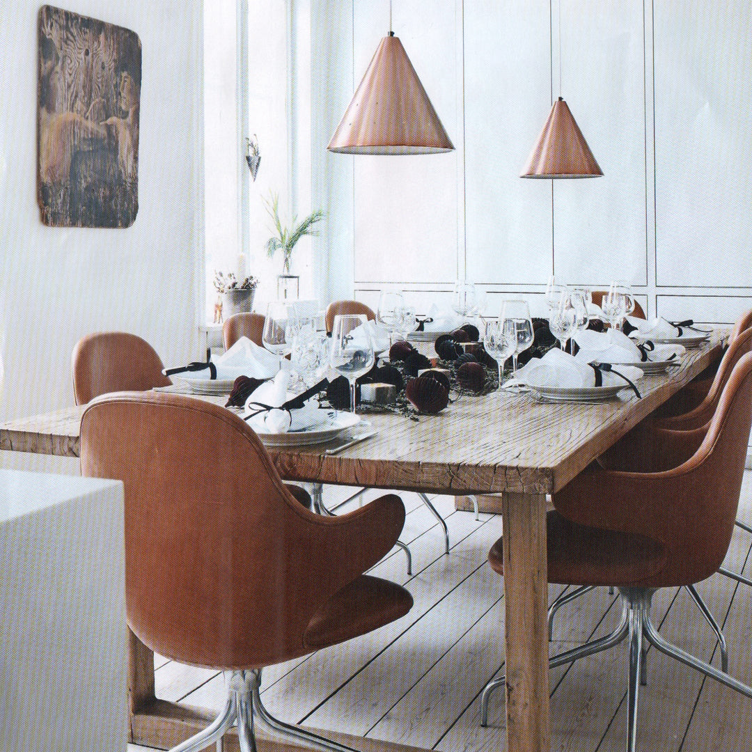 Now &Tradition is introducing CATCH CHAIR in a new swivel base edition, making the comfortable chair even more flexible and suited for the contract and conference market. The new swivel base enhances the chair's light and playful expression and serpentine lines and acts as the perfect base for the high quality shell. The swivel base is in cast aluminum and the shell is made from molded polyurethane foam with a metal frame and glass fiber reinforcements. Covered in cold cured foam, and finally, leather or textile upholstery, the shell offers comfort and great variability.