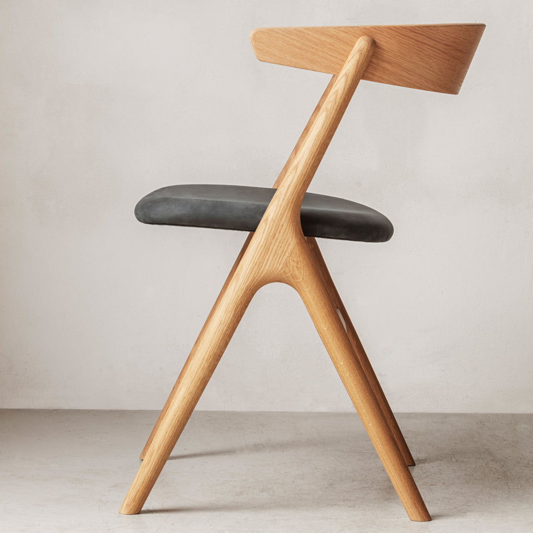 Sibast No 9 is a light dining chair with an unfailing sense of style, closely related to the slightly larger, more complex Sibast No 7 and Sibast No 8. The interconnectedness with Sibast No 8 is particularly obvious: both are distinguished by a Y-shaped frame, a distinctive, trendsetting element which, in addition to its visual value, serves to strengthen the chair. In Sibast No 9, however, the Y is inverted and its predecessor’s graphically powerful back with bars is replaced by a single curved top rail and armrest.