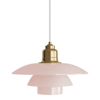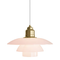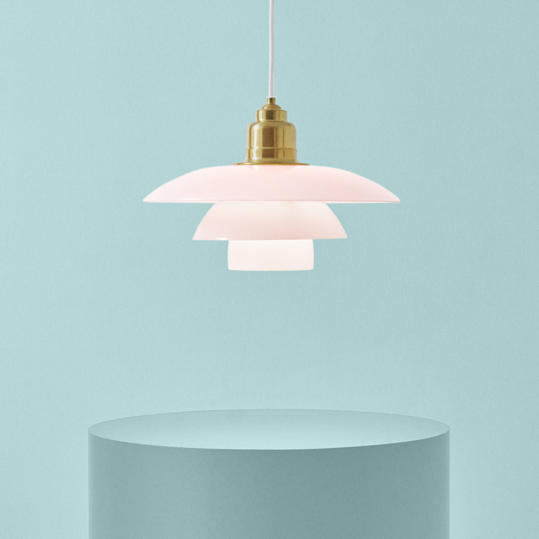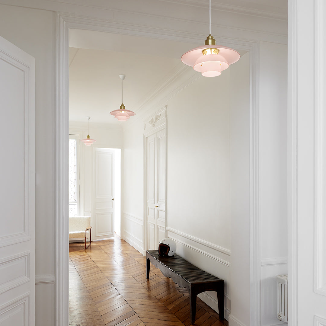 The PH 3 ½-3 Glass Pendant is one of many advanced projects undertaken by Poul Henningsen in the development of his world-famous three-shade system from 1926. Poul Henningsen devoted most of his life to taming electric light. He based his three-shade design on a logarithmic spiral to make optimum use of the light source. He was constantly doing calculations and tests. The form of the shades was determined by the way they were required to shape and reflect the light, and the lamp was designed to be glare-free. The white opal glass shades soften the overall look of the lamp and illuminate its surroundings with a perfect, harmonious and glare-free light that only the classic three-shade system is capable of emitting. The shades are mouth-blown three-layer opal glass, which is glossy on top and sandblasted matt underneath to provide soft and uniform light distribution.