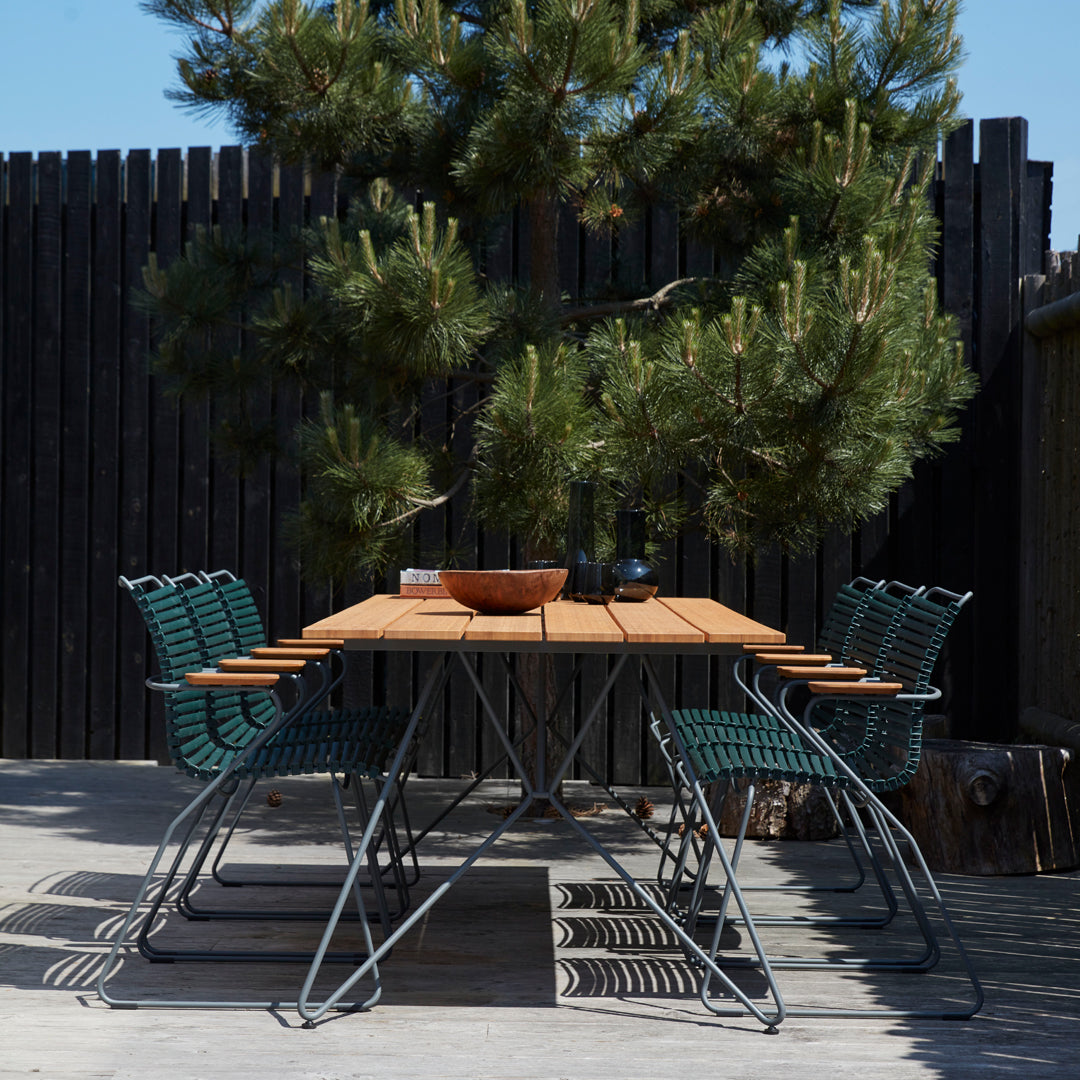 SKETCH outdoor table with lamellas in bamboo. The beautiful sculpted metal legs give the SKETCH table a minimalistic look. The leg construction makes the table completely stable. The bamboo table top is pre-oiled.