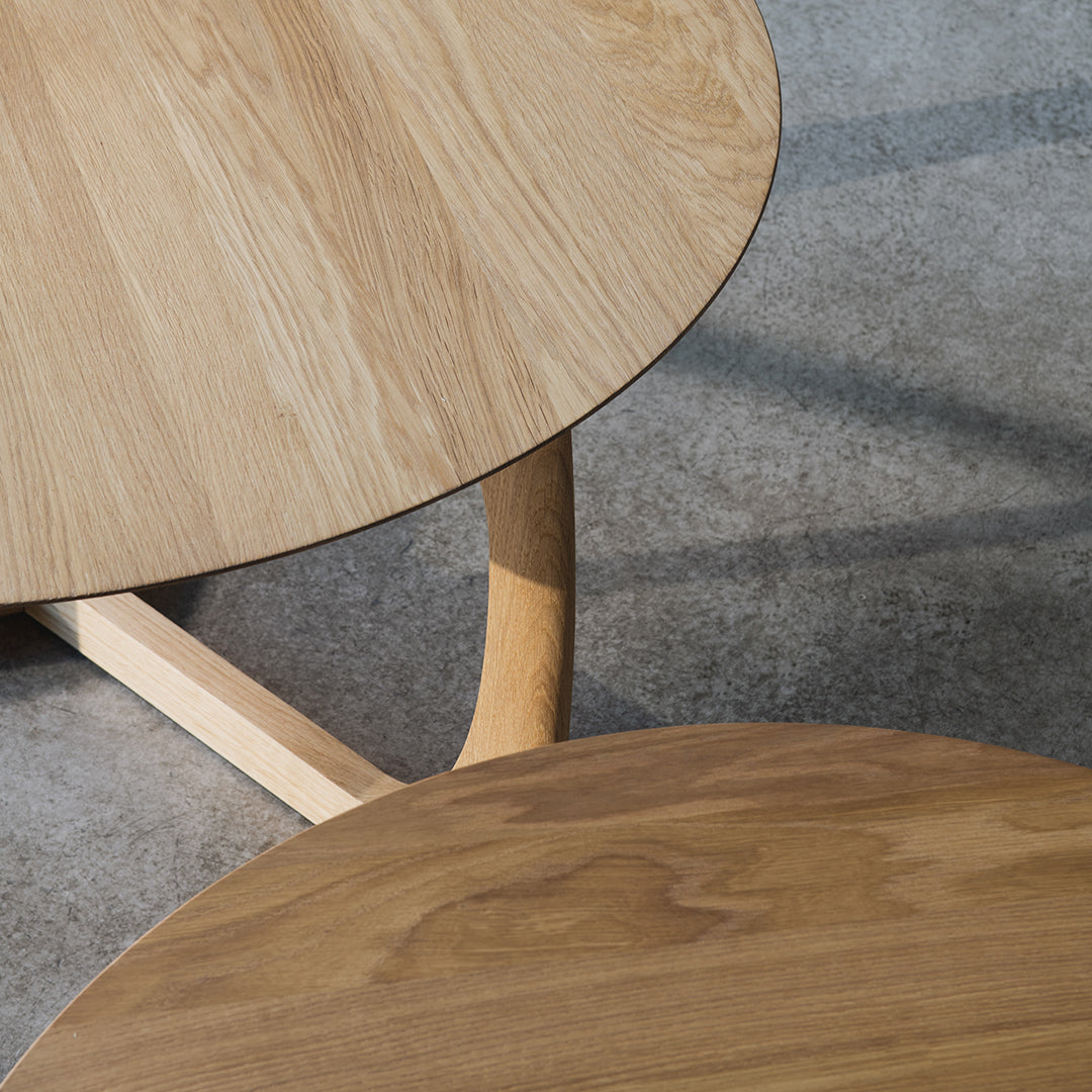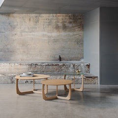 With a distinctive appealing sculptural shape lili is reminding of a water lily. The soft and harmonious connection between tabletop and frame creates an elegant curve made possible by highly precise construction and assembly technique. The tabletop in oak or glass is supported by a strong base made of solid oak.