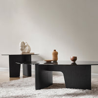 Symbolic, archaic references and a sculptural silhouette define the Glyph Occasional Table. A slightly translucent tabletop in black-tinted glass appears to be floating while revealing the characteristic cross-sectional view of the base components in black-stained oak veneer.