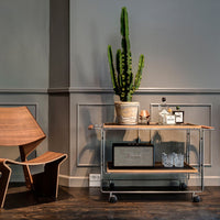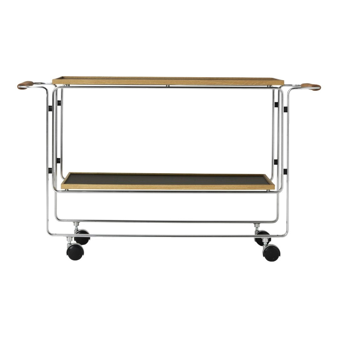 The HB 128 Bar Cart is a bar cart with leather handgrips and two black trays with oak edges.
