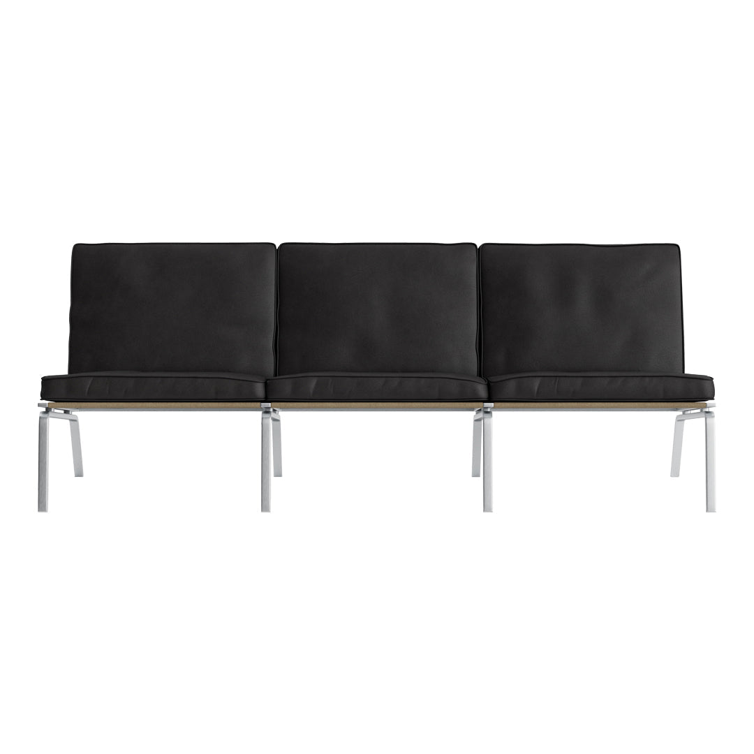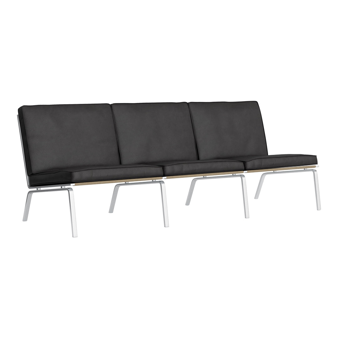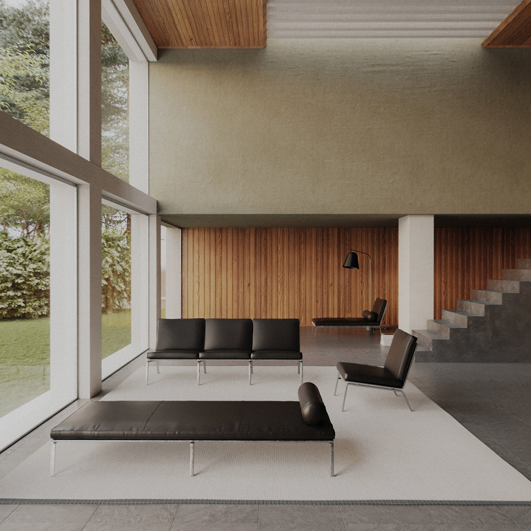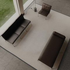 The series consists of two- and three-seater sofas, lounge chair, daybed, chaise longue, coffee table and side table. The leather cushions come upholstered with various types of Premium or Vintage hides from Sørensen Leathers and the tables come with a fine black marble from the Iberian peninsula or a veiny green Indian marble.