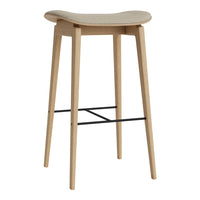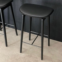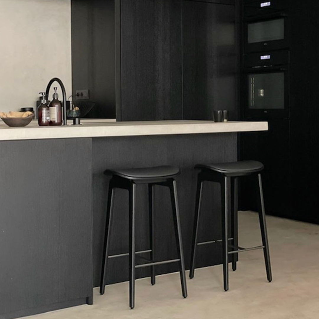 The NY11 Bar Chair has a frame hand-crafted from solid white oak and a seat of laminated oak veneer. The leather edition has a seat cushion upholstered with premium leather from Sørensen Leather.