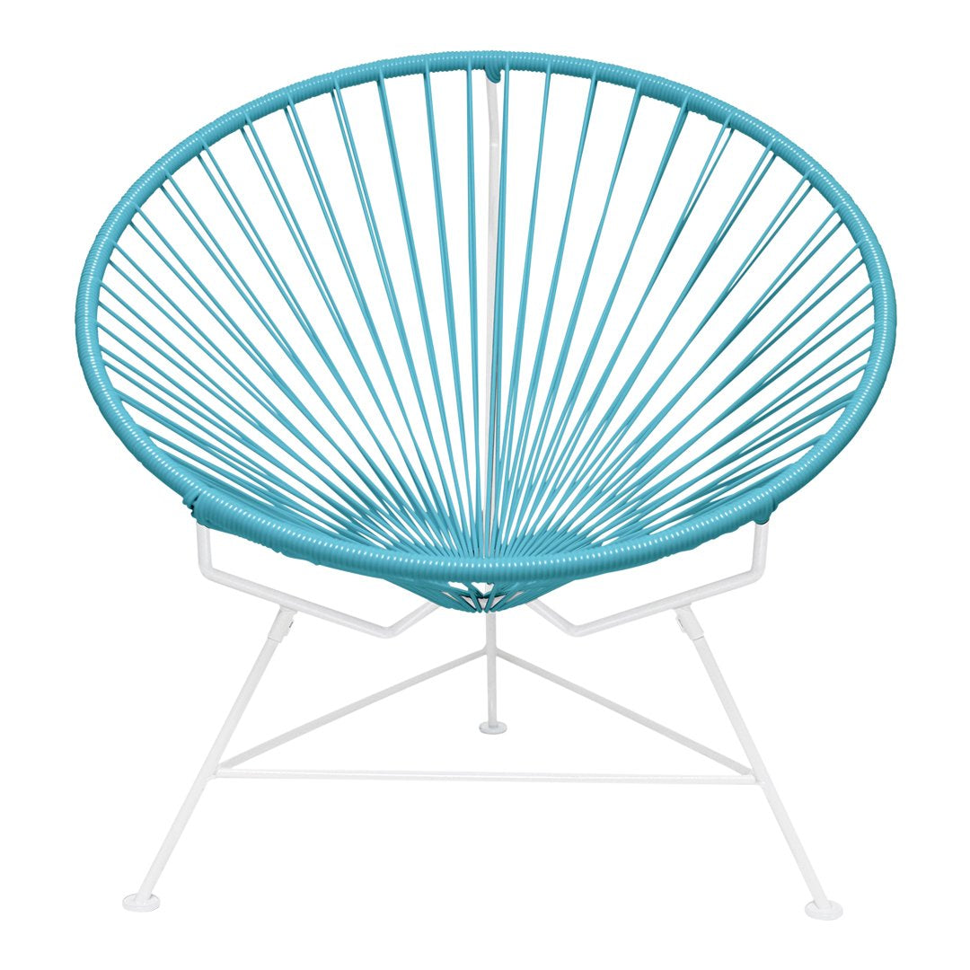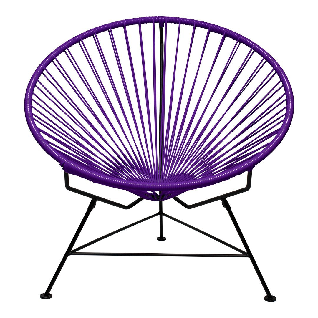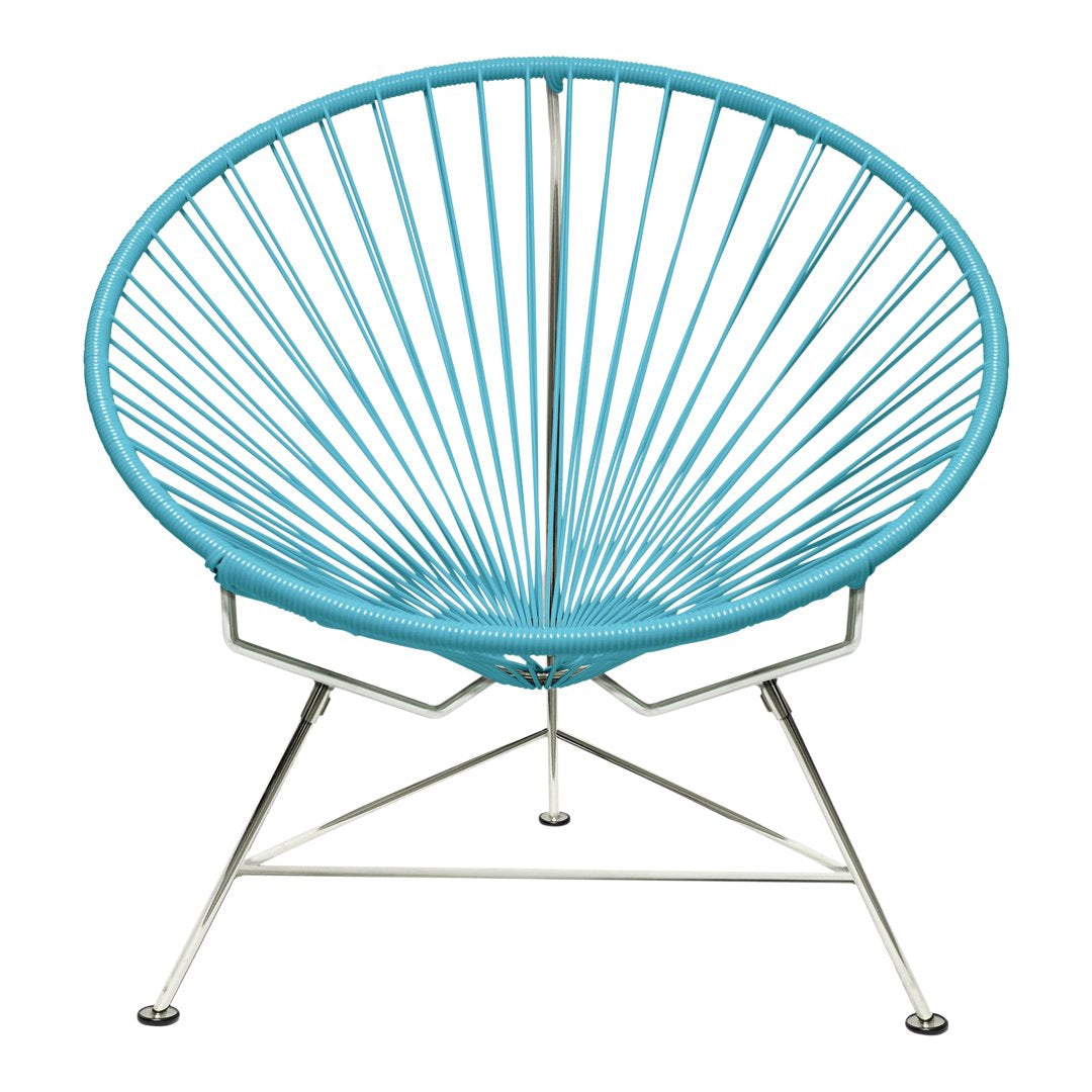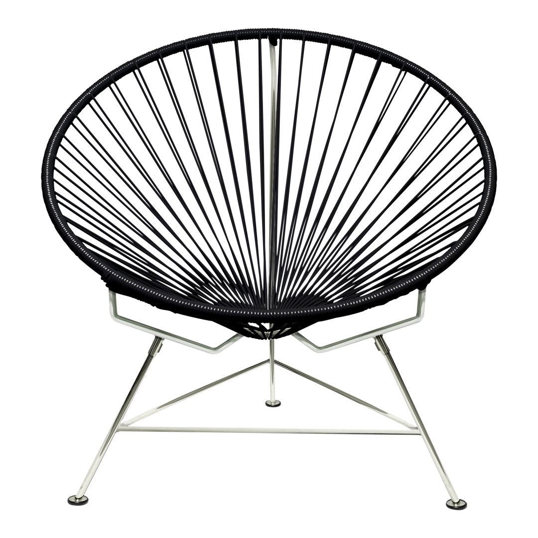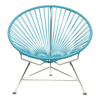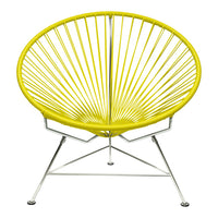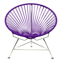 The Innit Chair - contemporary lounge or occasional chair suitable for indoors and out. Composed of a tripod metal base and seat woven with vinyl cord. The Innit chair is similar in construction and form to our Acapulco chair though slightly less reclined with a circular frame. The galvanized steel frame is rust resistant, and the very durable yet flexible, UV protected vinyl will stay colorfast for years. This chair is incredibly comfortable without a cushion. It's weatherproof, breathable, stackable, easy to clean, and available in everybody's favorite color. A great, modern design for commercial and residential applications. Pretty good innit