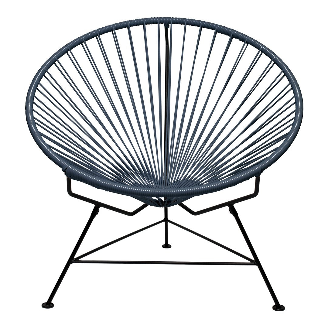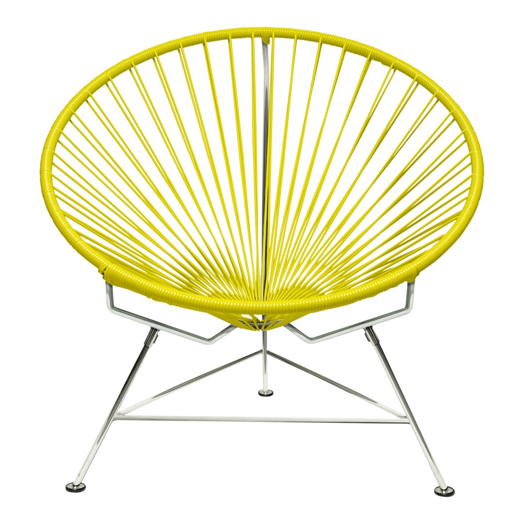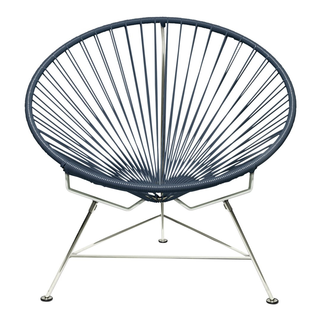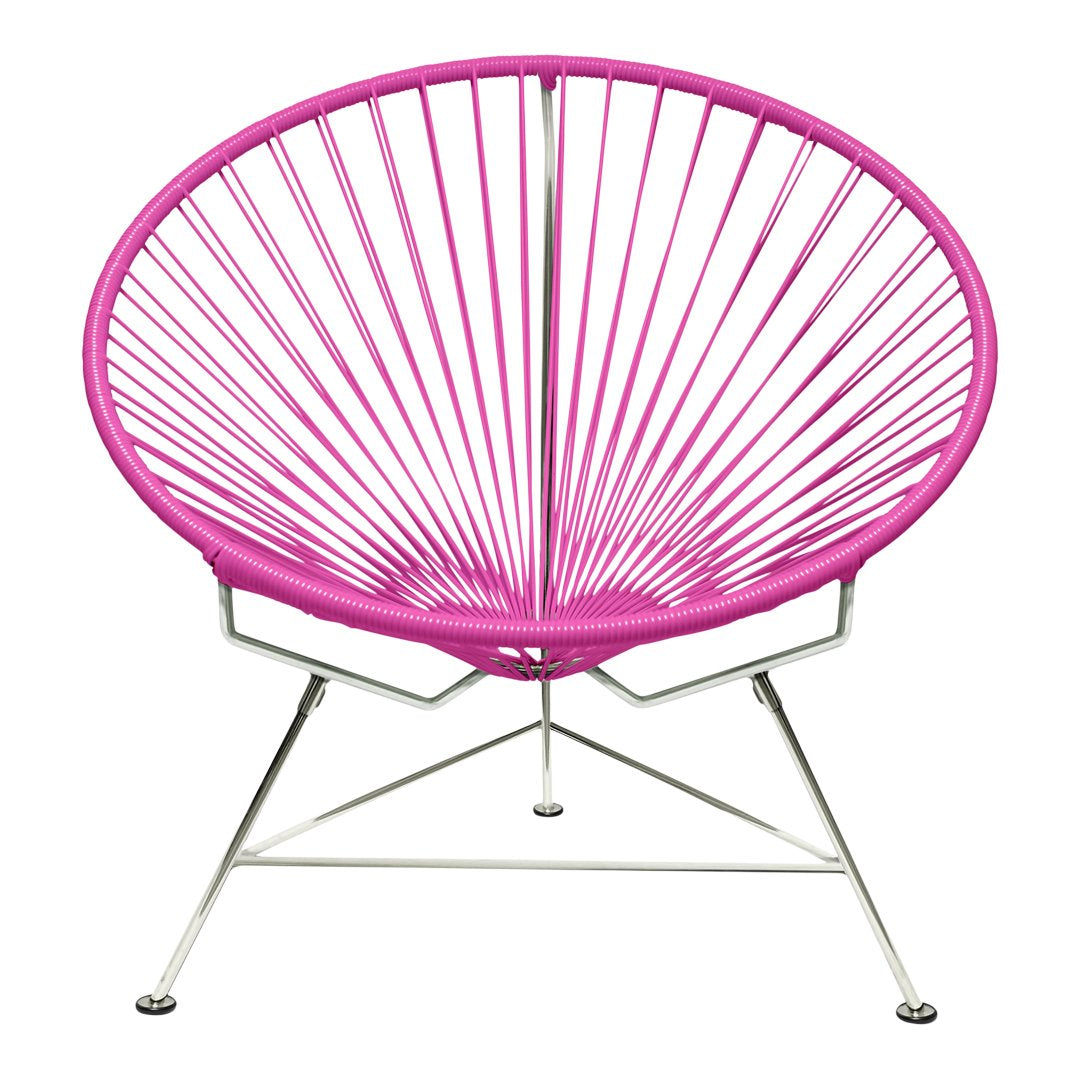 The Innit Chair - contemporary lounge or occasional chair suitable for indoors and out. Composed of a tripod metal base and seat woven with vinyl cord. The Innit chair is similar in construction and form to our Acapulco chair though slightly less reclined with a circular frame. The galvanized steel frame is rust resistant, and the very durable yet flexible, UV protected vinyl will stay colorfast for years. This chair is incredibly comfortable without a cushion. It's weatherproof, breathable, stackable, easy to clean, and available in everybody's favorite color. A great, modern design for commercial and residential applications. Pretty good innit