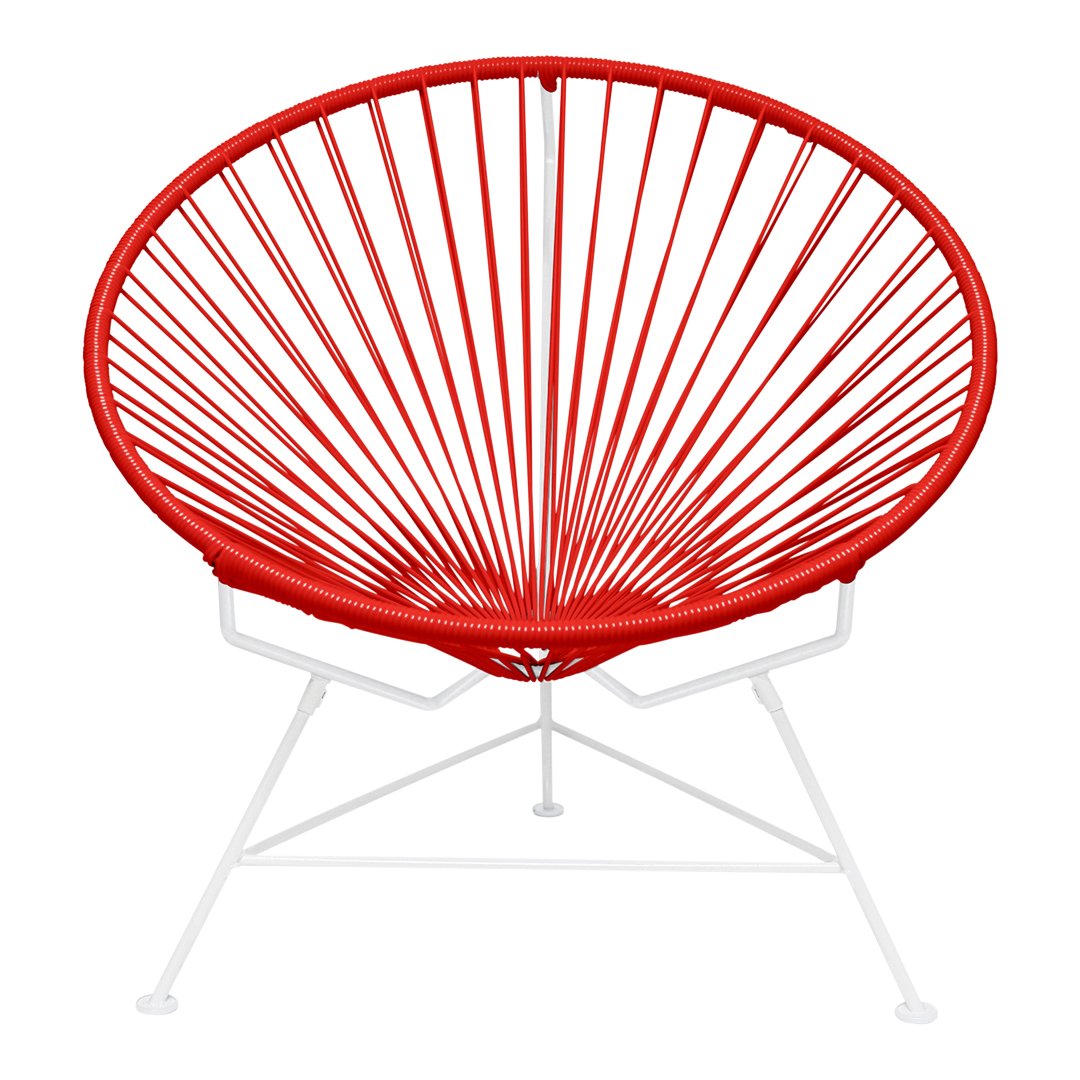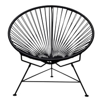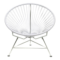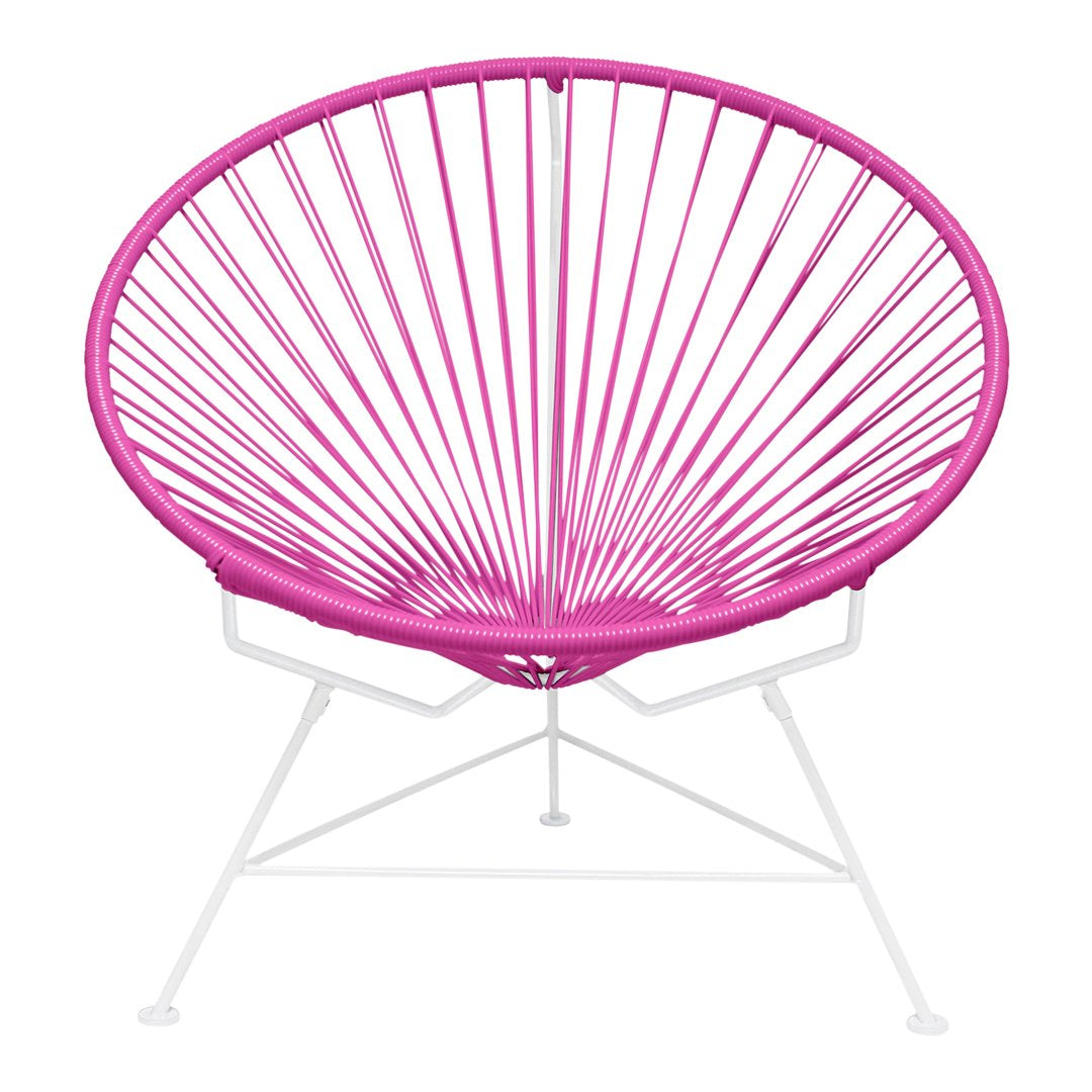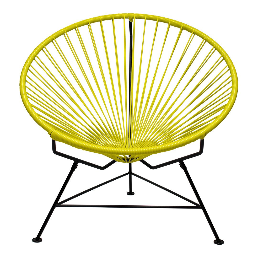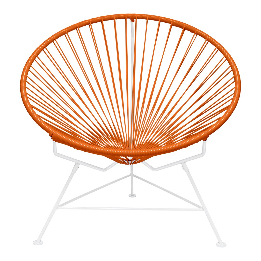 The Innit Chair - contemporary lounge or occasional chair suitable for indoors and out. Composed of a tripod metal base and seat woven with vinyl cord. The Innit chair is similar in construction and form to our Acapulco chair though slightly less reclined with a circular frame. The galvanized steel frame is rust resistant, and the very durable yet flexible, UV protected vinyl will stay colorfast for years. This chair is incredibly comfortable without a cushion. It's weatherproof, breathable, stackable, easy to clean, and available in everybody's favorite color. A great, modern design for commercial and residential applications. Pretty good innit