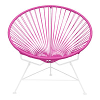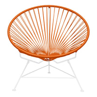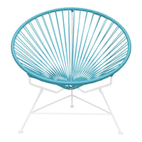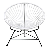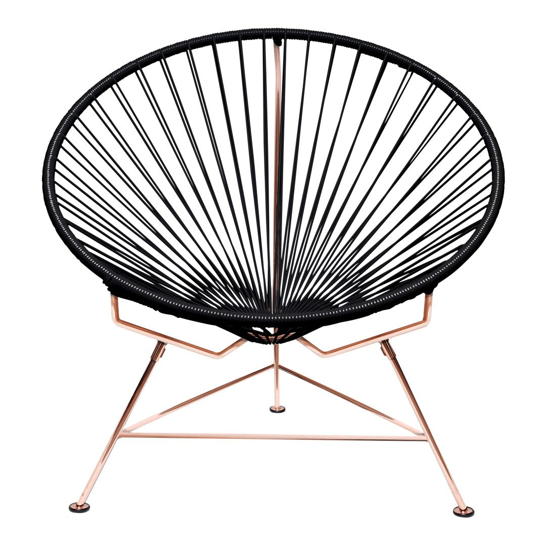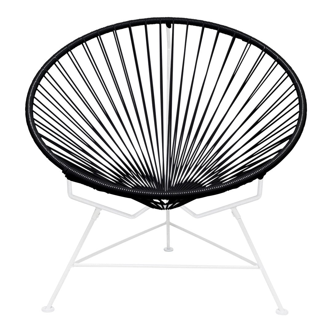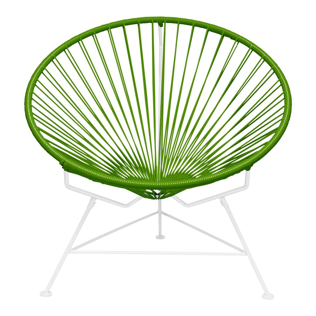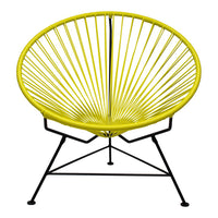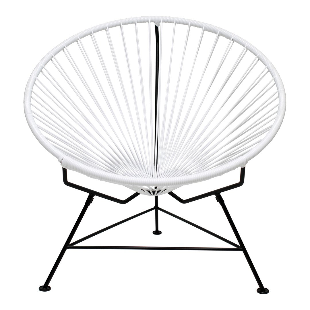 The Innit Chair - contemporary lounge or occasional chair suitable for indoors and out. Composed of a tripod metal base and seat woven with vinyl cord. The Innit chair is similar in construction and form to our Acapulco chair though slightly less reclined with a circular frame. The galvanized steel frame is rust resistant, and the very durable yet flexible, UV protected vinyl will stay colorfast for years. This chair is incredibly comfortable without a cushion. It's weatherproof, breathable, stackable, easy to clean, and available in everybody's favorite color. A great, modern design for commercial and residential applications. Pretty good innit