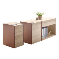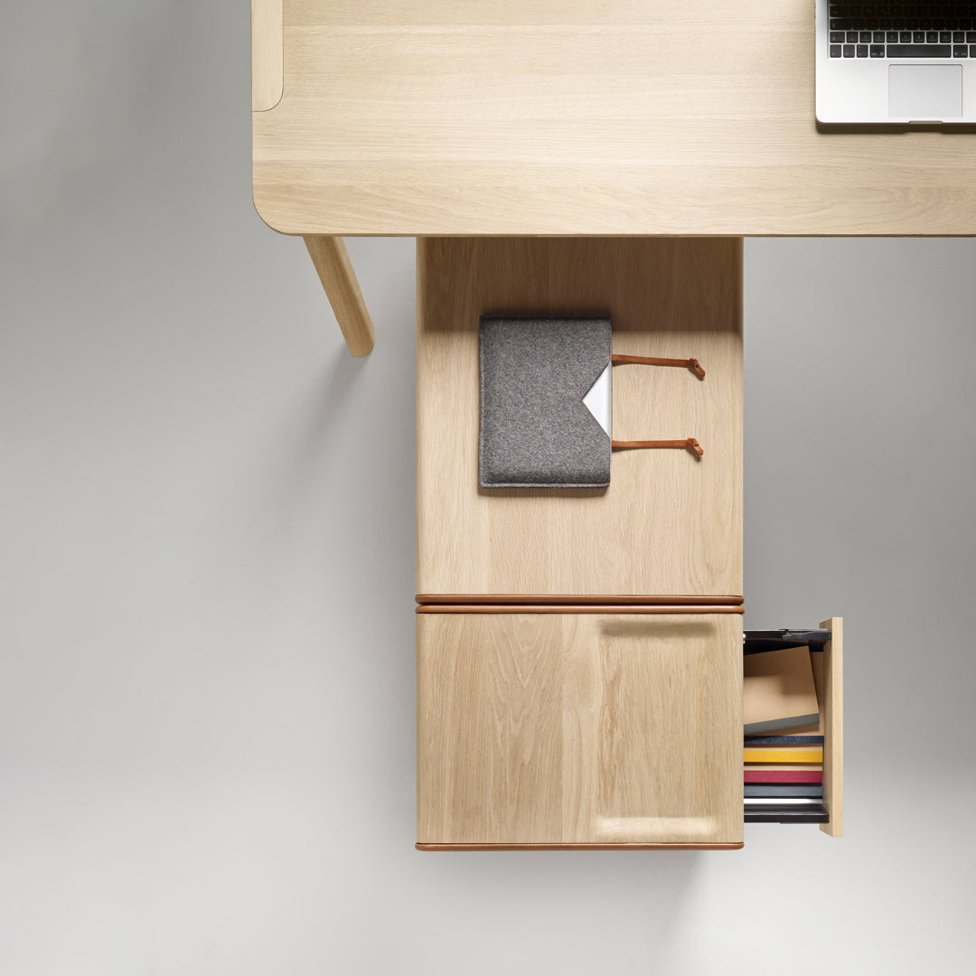 Among other possibilities, the Heldu desk collection offers several storage devices made of oak: mobile containers available with drawers and folders storage, as well as a furniture system whose ingenious design allows it to integrate with Heldu office desk.