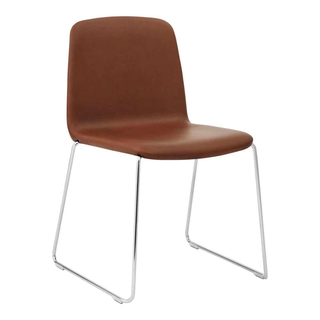 Just is a simple and understated stackable shell chair with lots of personality and character that is as beautiful when seen from below as from above. The frame is discretely tucked into the chair's molded shell, and the shell's tapering thickness gives it a friendly and welcoming expression. Just Chair comes in a veneer version in a distinctive black or in natural, with a striking colored edge in black, red or grey. Just Chair is also available with upholstery in quality four textiles and durable leather, adding a whole new dimension to the chair. The chair fits into most furniture schemes, and is ideal both around the dinner table and in the kitchen.