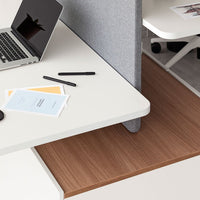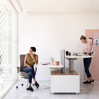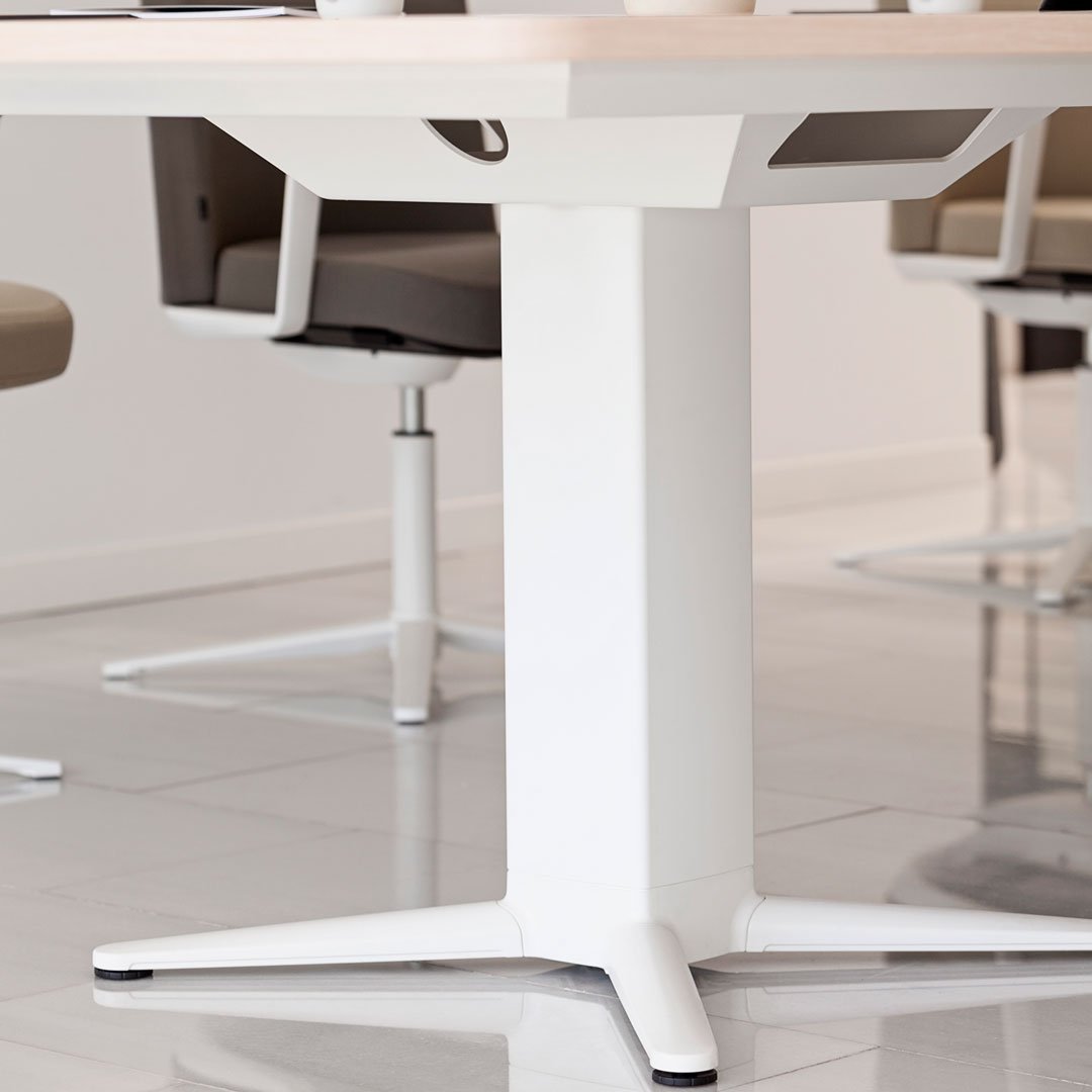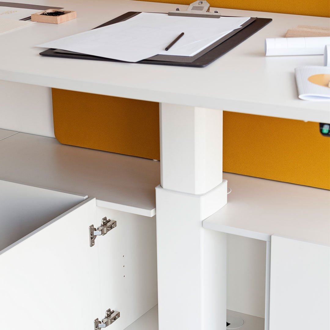 Gen operative system allows the combination of different desks with independent height adjustable systems to create spacious workspaces in dynamic operative environments. Optional acoustic screens are available. The central structure is made of three columns with 4 star bases and integrated non-slip footrests that also improve the stability of the set.