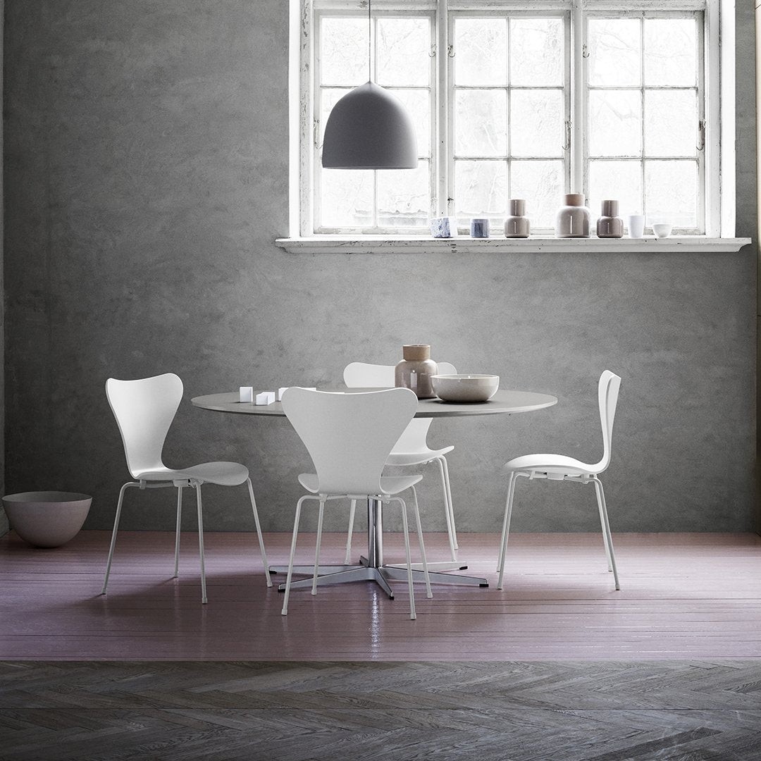 The Table Series was designed by Arne Jacobsen and comes with a 4 star pedestal base (29.5 or 35.4 inch diameter) or a 6-star base (47.2 or 57.1 inch diameter)