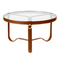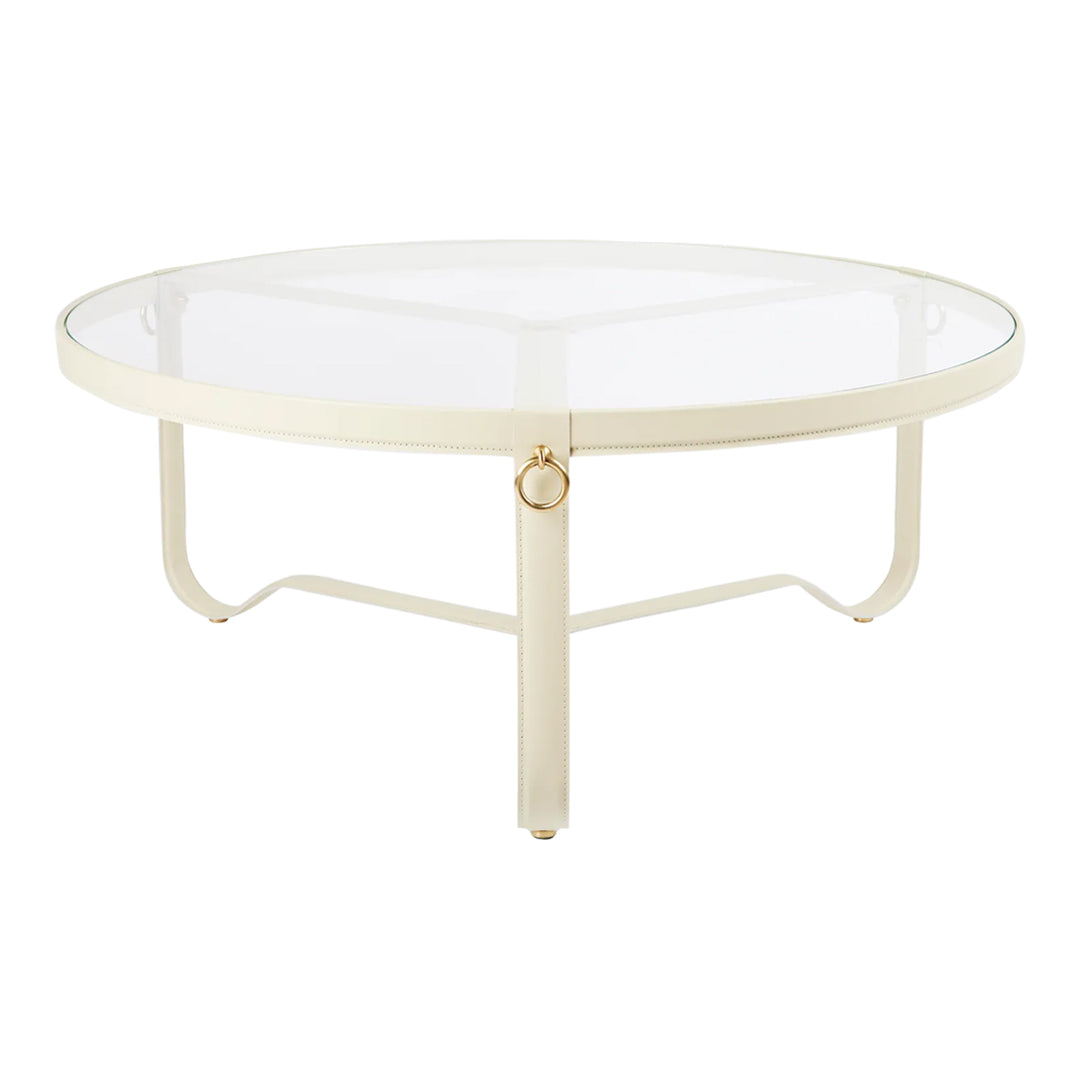 Placed on three soft curved metal legs, elegantly meeting in the heart of the table, the round glass top is edged with a hand-made leather rim and adorned with three gilded brass rings. The timeless design of the Adnet Coffee Table embodies modern materials and superb craftsmanship and adds a distinctive value to any home or professional space.