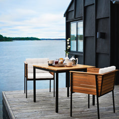 Haringe is a lounge range made in teak. Its frames feature brushed stainless steel or powder coated black. Haringe Dining Table is available in three different sizes, and is suitable for outdoor use.