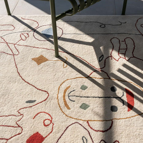 Depicted with a delicate stroke, the illustration defines the silhouettes of several imaginary characters that intertwine and coexist in a beautiful composition. Hayon subtly introduces color through small elements brimming with personality that help to interpret each of the images. Nine faces are distributed at different angles so that the rug can be viewed from any perspective, fitting perfectly in any space.