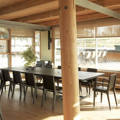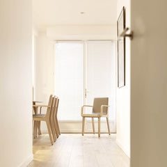EMEA is a solid oak chair. It can be with or without arms and it is available two heights of back. It can be finished completely in oak or the seat can be covered in leather or fabric.