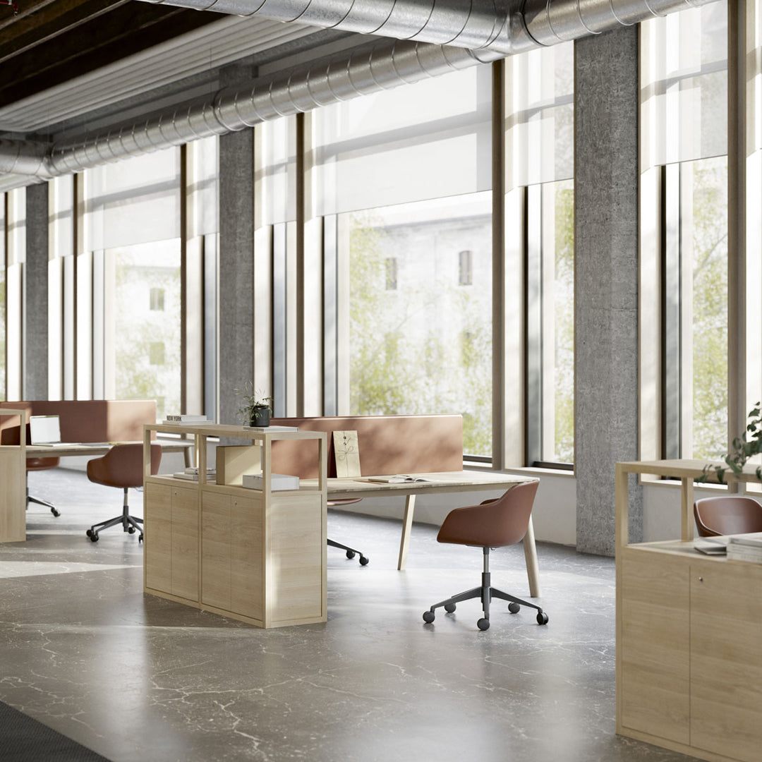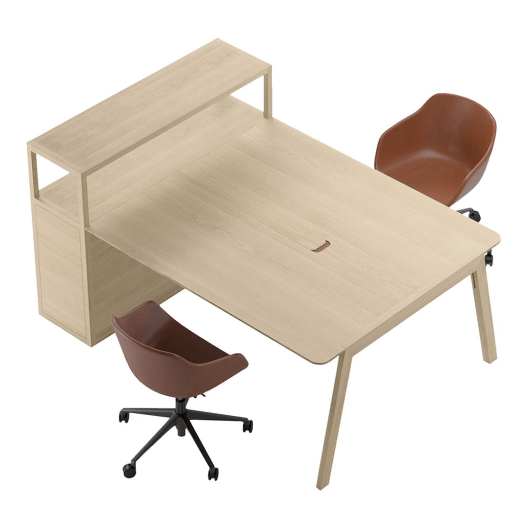 The Heldu office collection offers several storage devices in oak wood: mobile containers available with drawers and file storage as well as a furniture system whose ingenious design allows it to be integrated into the desk table. Heldu work.
