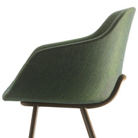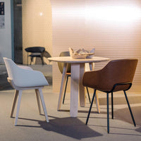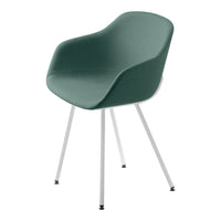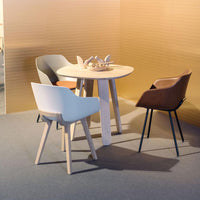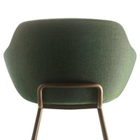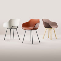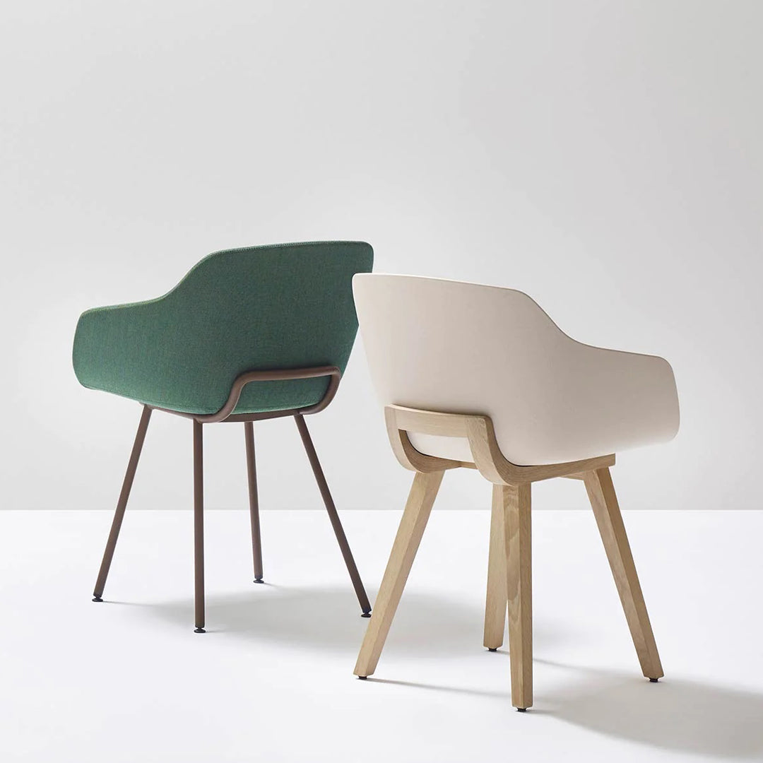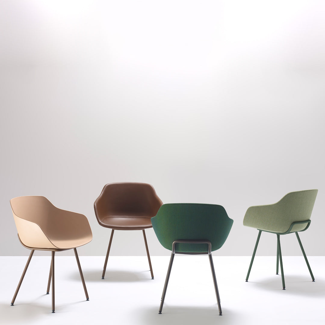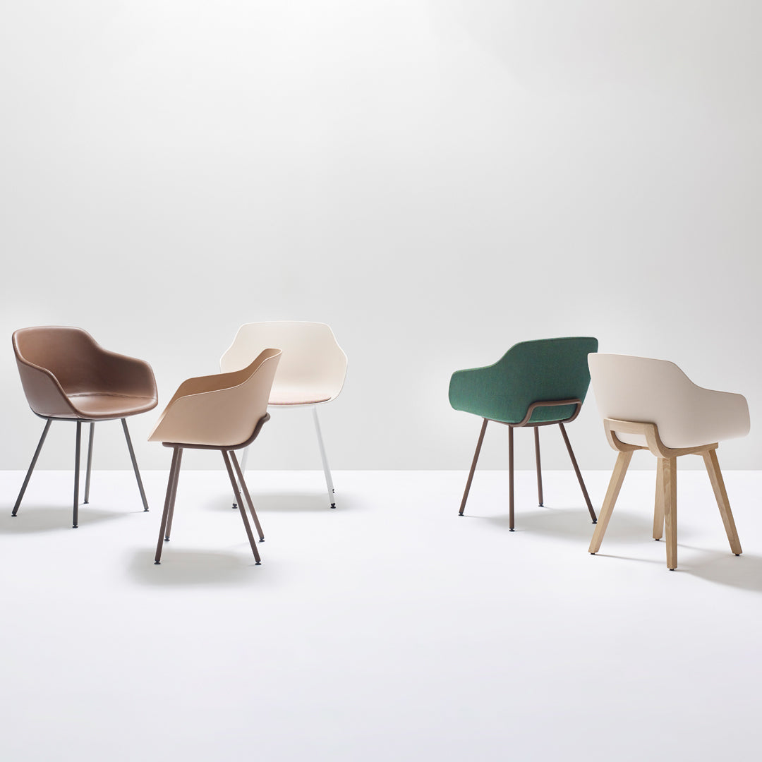 The comfortable and generously-sized Kuskoa Bi is the first chair on the market to be manufactured in bioplastic. Its particularly enveloping shell, cut out in such a way as to optimize back and arm support, is delicately placed on a metal trestle. Different upholstered versions are also available.