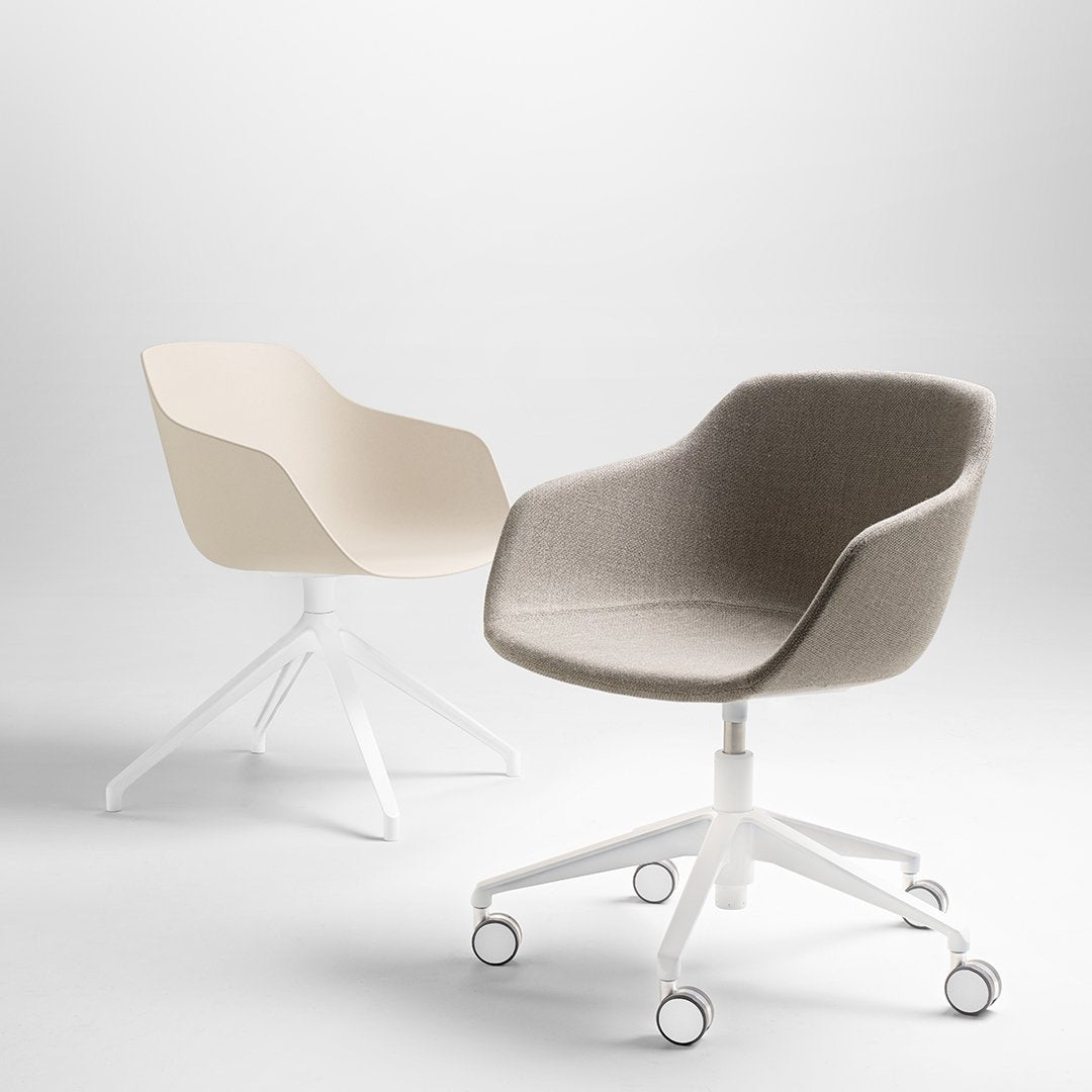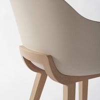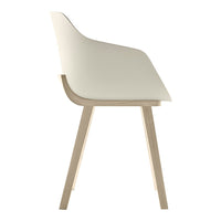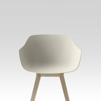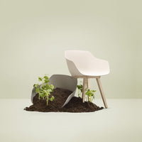The comfortable and generously-sized Kuskoa Bi is the first chair on the market to be manufactured in bioplastic. Its particularly enveloping shell, cut out in such a way as to optimize back and arm support, is delicately placed on a solid wood trestle. Different upholstered versions are also available.