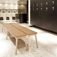 This bench completes Laia collection seating propositions. The structure is in solid oak. The seat can be covered with fabric, leather or eco-leather. For the backrest version, the rear is in felt. Back in natural felt.