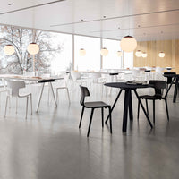 The model with the central base, which comes with either a round or square top, sits effortlessly in public settings, such as bars and restaurants, or private surroundings, like dining rooms with a contemporary vibe. The rectangular version, featuring a more generously sized surface, instead makes an excellent choice for study halls, meeting rooms and canteens, which need to seat more people.