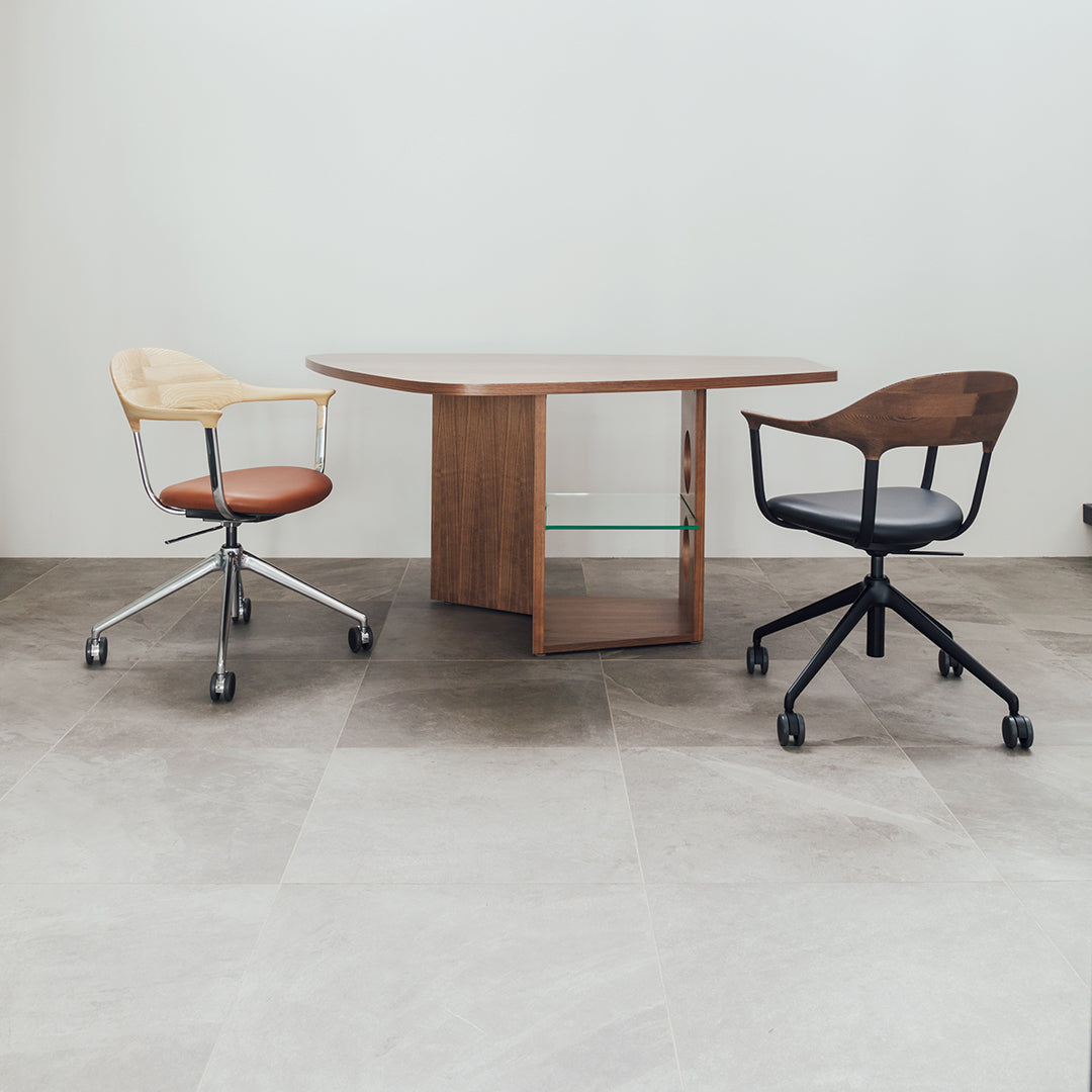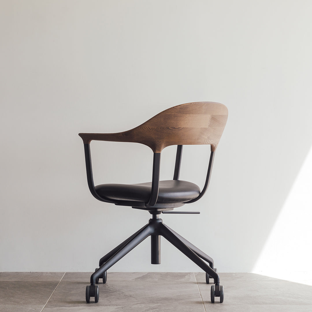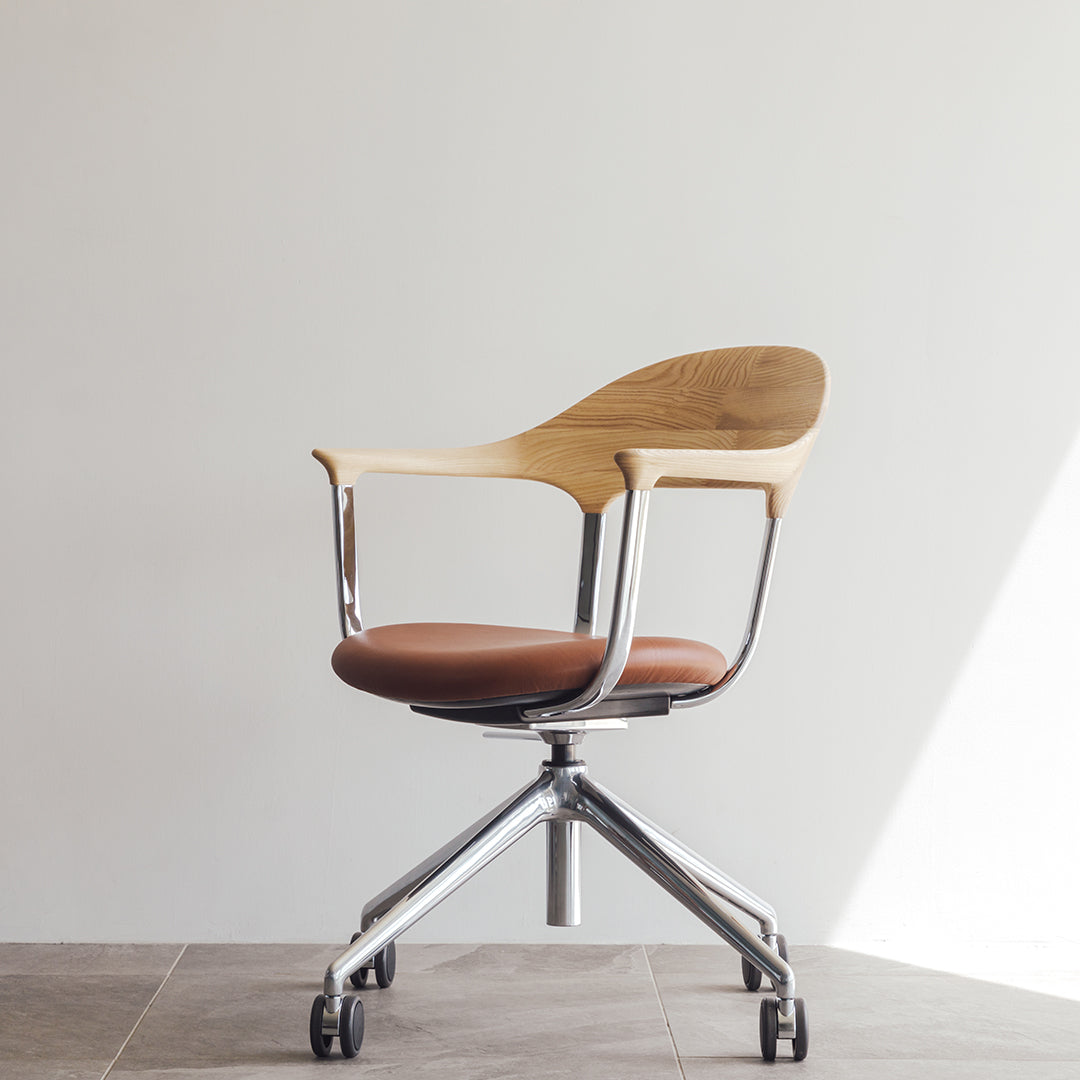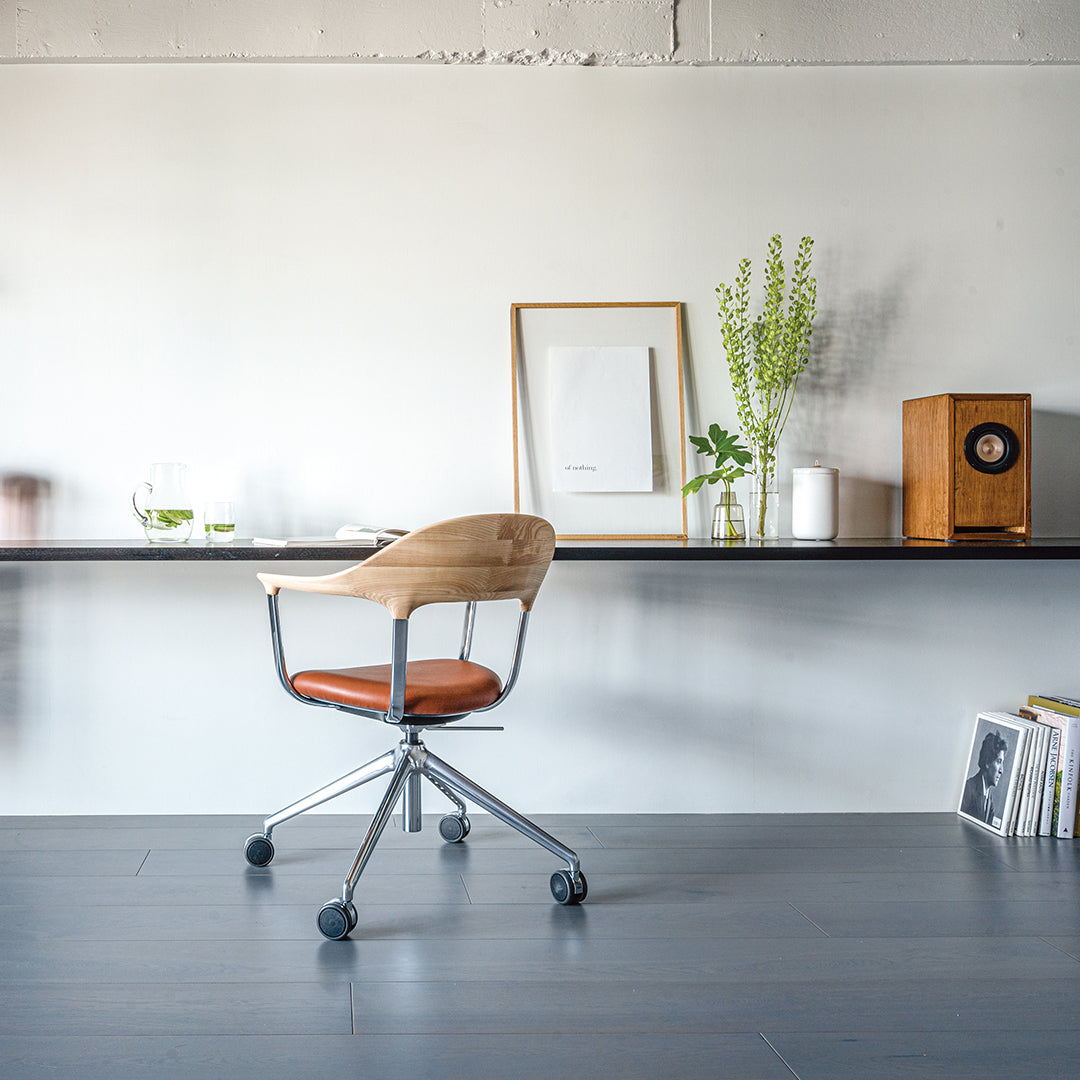 During COVID, as remote work became more common, people realized the importance of chairs for work at home. That was a momentum for the development of the FOUR chair. Indeed, a wide variety of office chairs good in design and function already existed before that, but few that fit in the atmosphere of living and dining rooms at home. The elaborate and delicate design of the chair is the result of the collaboration of the four powers: namely, Actus and CondeHouse for development and manufacturing; Jin Kuramoto for design; KOKUYO for technical supervision. Please enjoy the functional chair made of wood, aluminum, and leather that show beautiful aging.