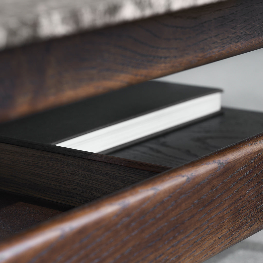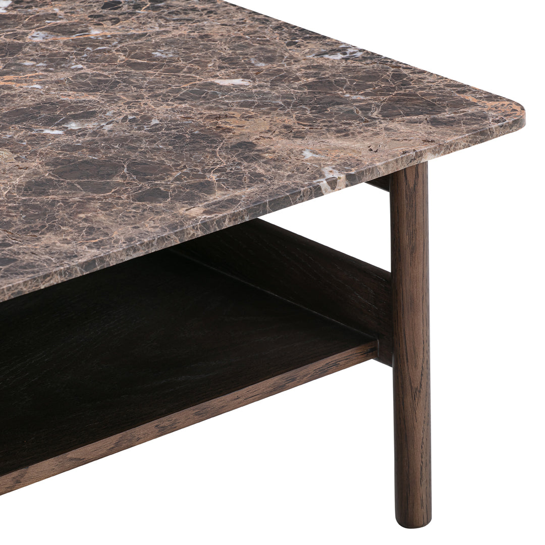 The material composition creates a compelling sensory dialogue between elements. The tabletop in rich brown Emperador marble introduces organic patterning and tactile luxury, while the FSC-certified solid oak and veneer base grounds the piece with natural warmth. The visible wood grain and meticulous staining process highlight Wendelbo's commitment to craftsmanship and material integrity. This thoughtful pairing creates a sophisticated table that complements both contemporary and transitional interiors with equal refinement.