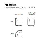 Module 8 (Corner, 90 Degree): 27.6" W x 27.6" D x 32.3" H | 19.1" SH
