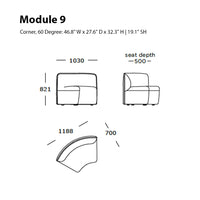 Module 9 (Corner, 60 Degree): 46.8" W x 27.6" D x 32.3" H | 19.1" SH