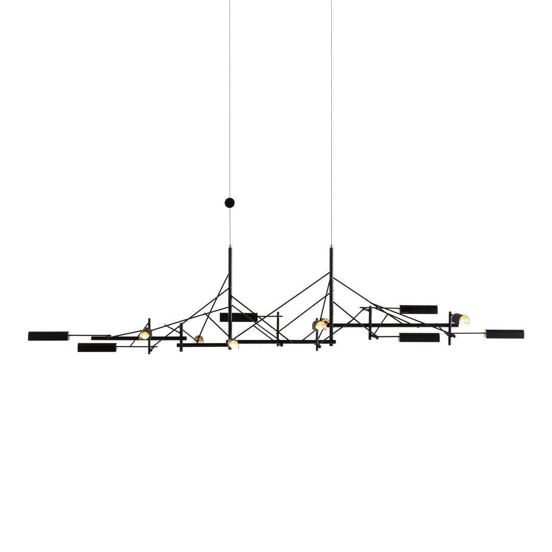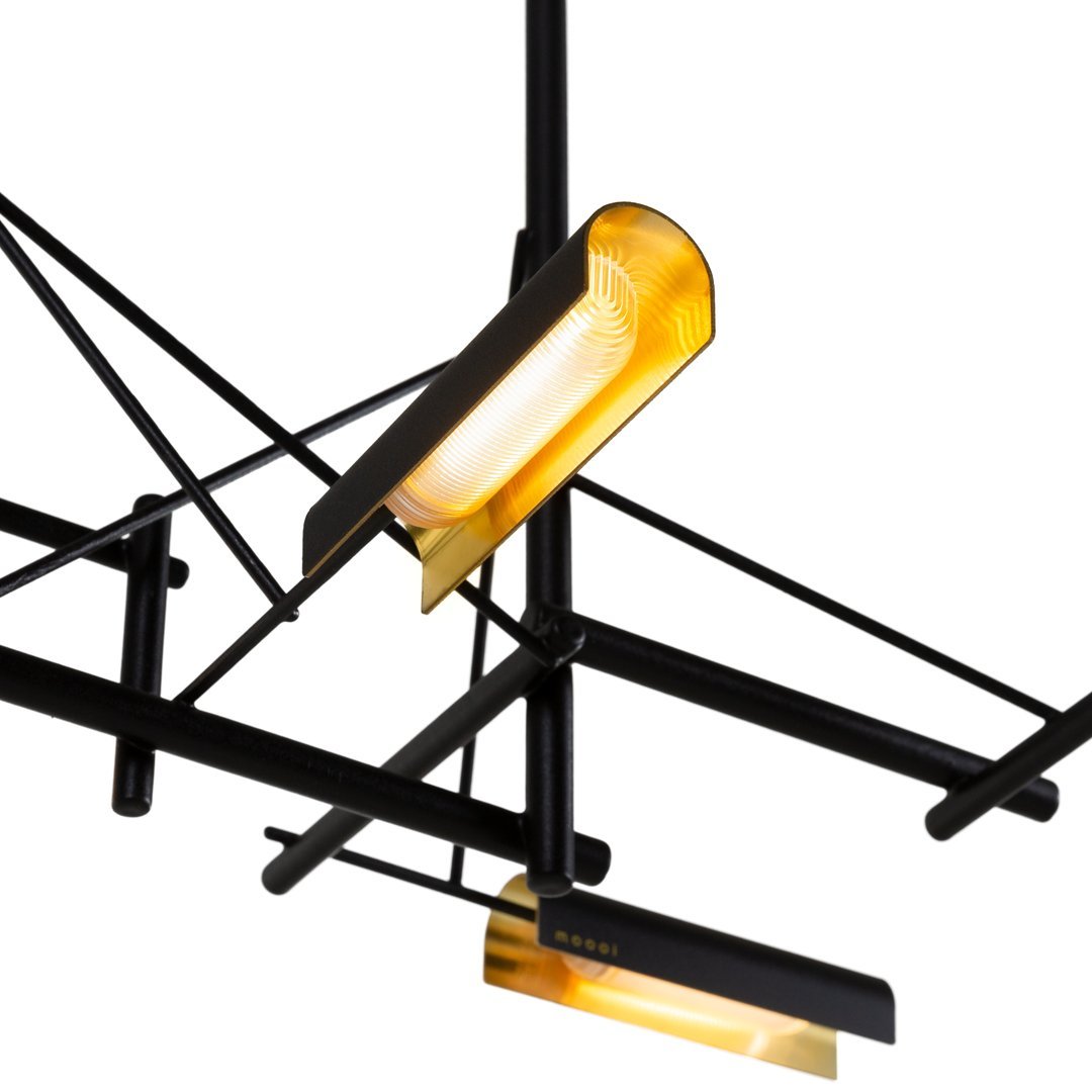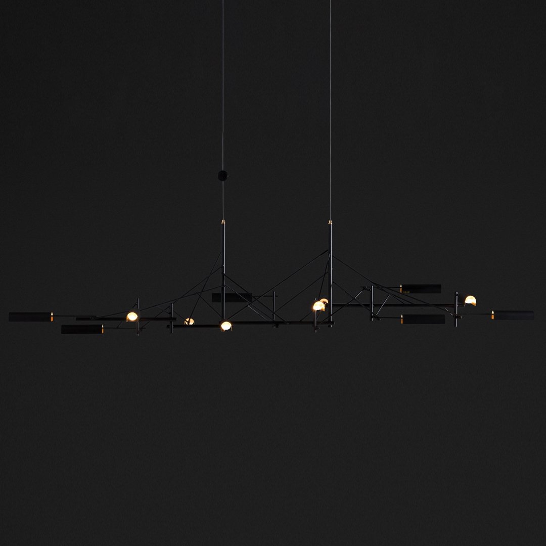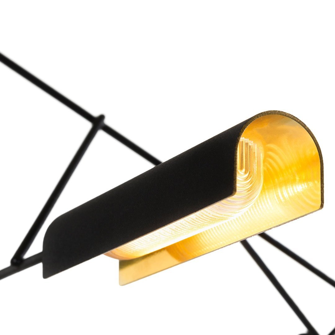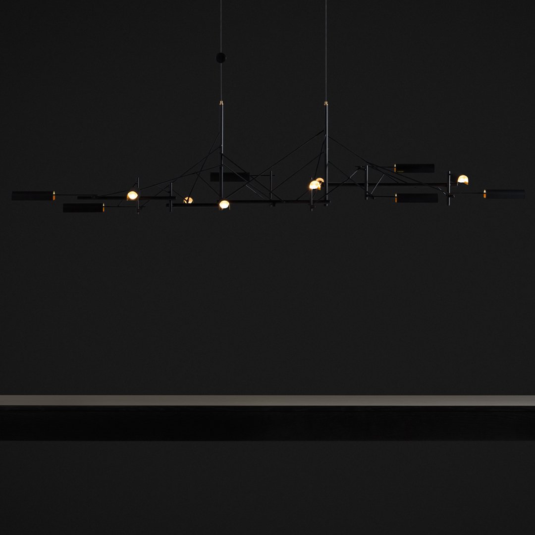 Tinkering, designed by Joost van Bleiswijk, captivates its spectators through a rhythmic composition that is made from black coated stainless steel and brass. This suspension lamp is available in two sizes, Tinkering 85 and Tinkering 140, which feature 7 and 12 LED light sources, respectively. The light caps are individually adjustable and make this lamp suitable to be installed above a table or a desk. Tinkering is powered through Electrosandwich technology by Marcel Wanders.