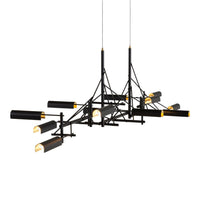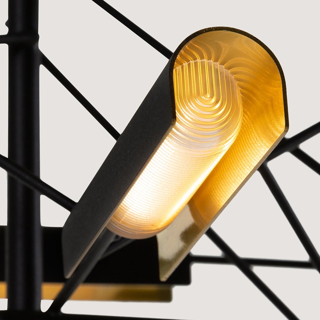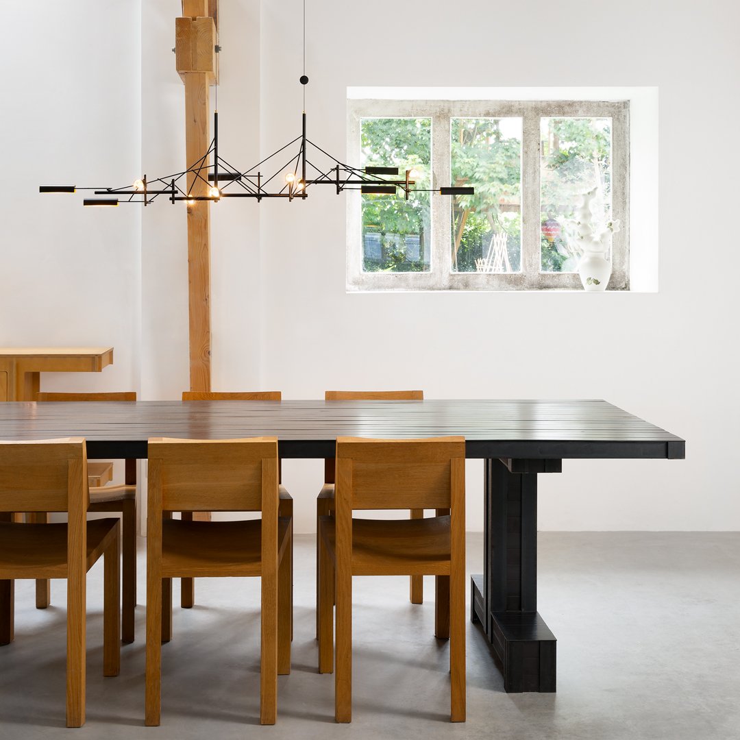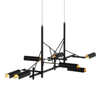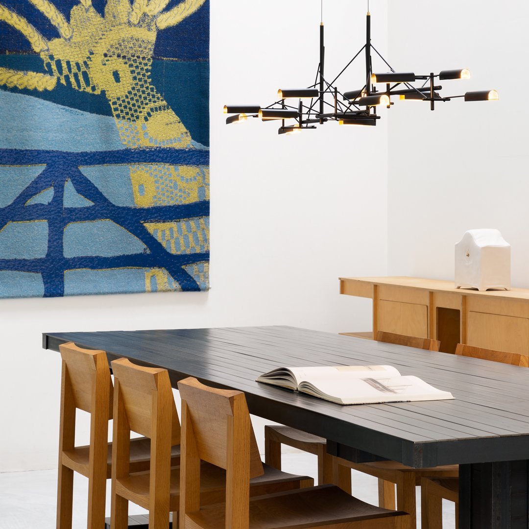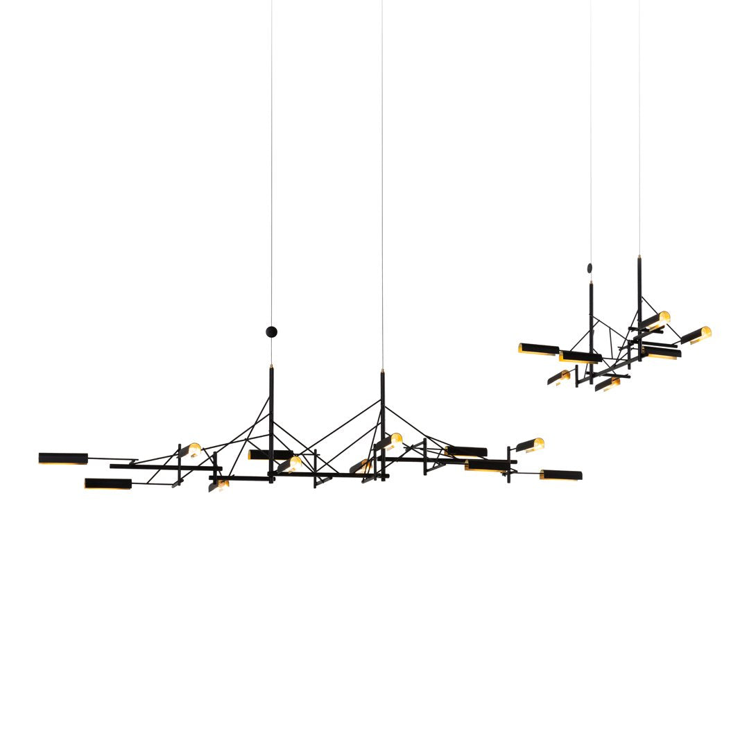 Tinkering, designed by Joost van Bleiswijk, captivates its spectators through a rhythmic composition that is made from black coated stainless steel and brass. This suspension lamp is available in two sizes, Tinkering 85 and Tinkering 140, which feature 7 and 12 LED light sources, respectively. The light caps are individually adjustable and make this lamp suitable to be installed above a table or a desk. Tinkering is powered through Electrosandwich technology by Marcel Wanders.