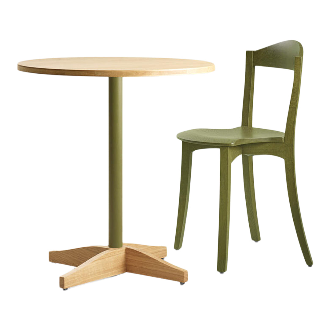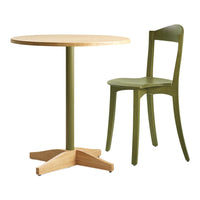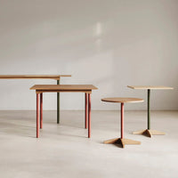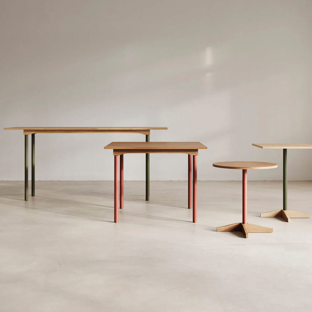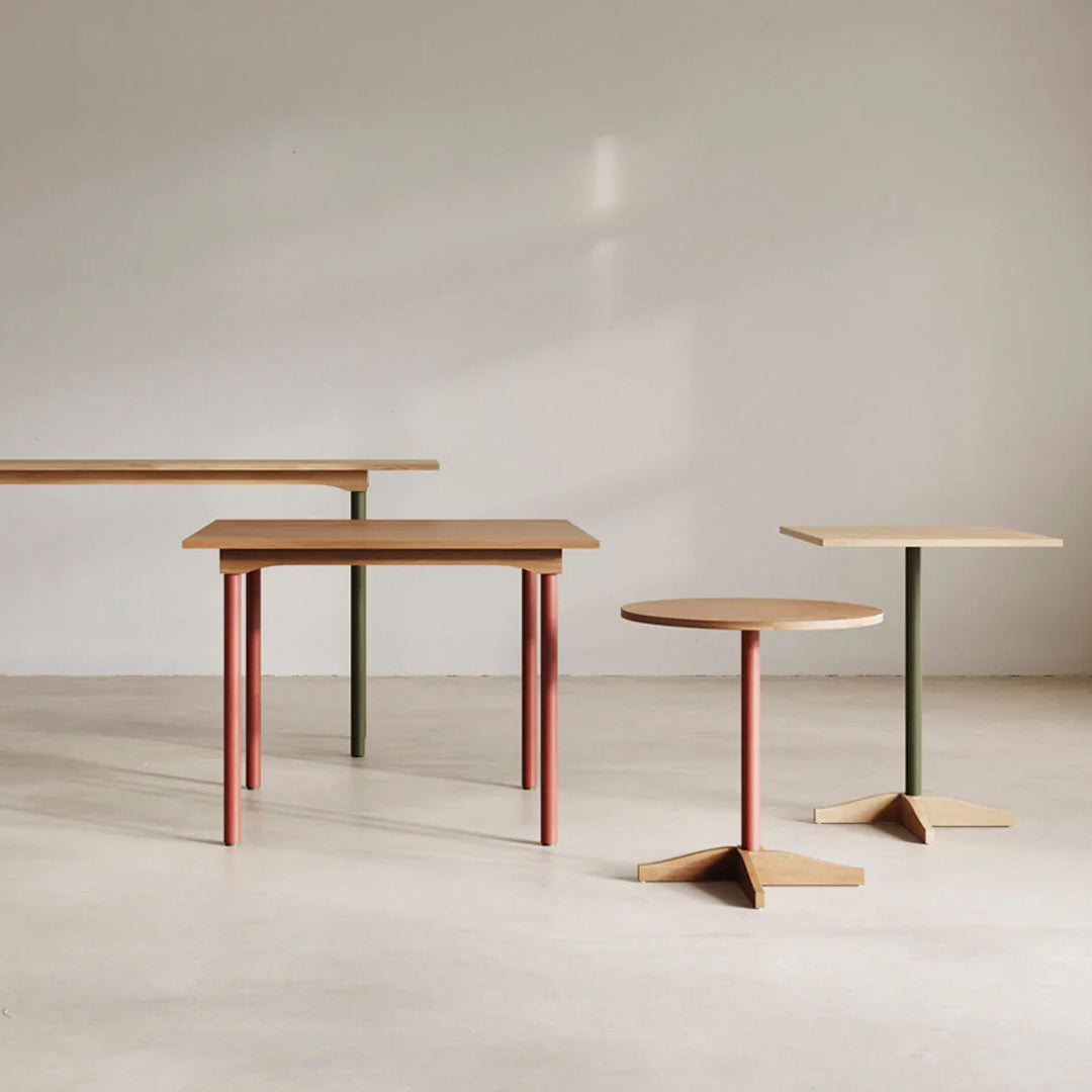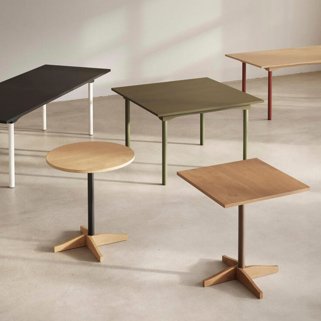 The Bibolina bistro table emulates all the charm of tables that adorned Parisian cafés and bistros at the beginning of the 19th century. By revisiting the lines of this iconic object, Julie Richoz has created a contemporary and versatile piece that adapts to different contexts and realms thanks to its compact shape and play on contrasting colours and materials. This practical and serviceable product can be disassembled and delivered flat. The table top and base are made from solid oak; its stem can be in wood or painted metal.