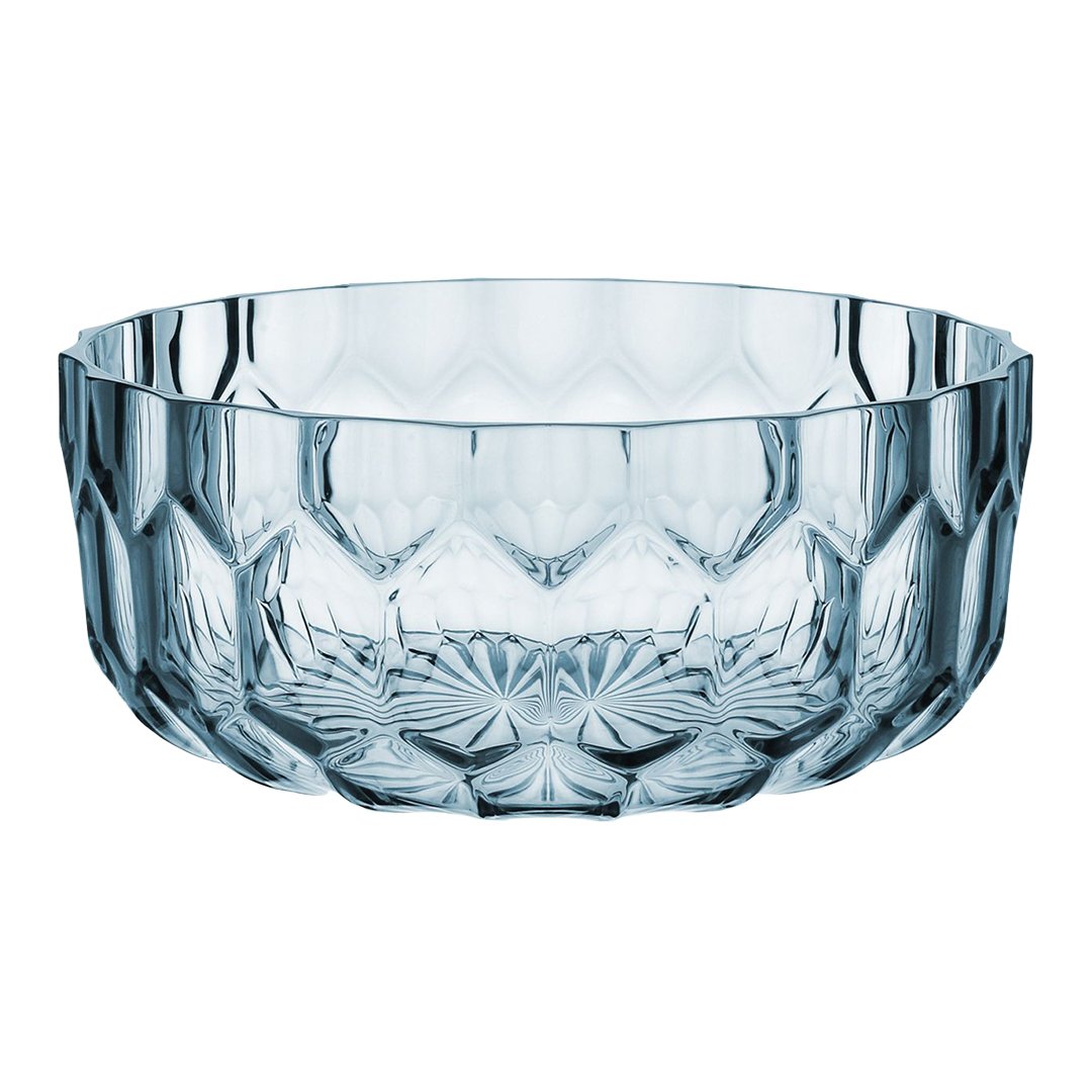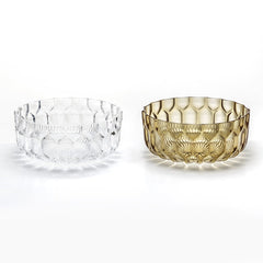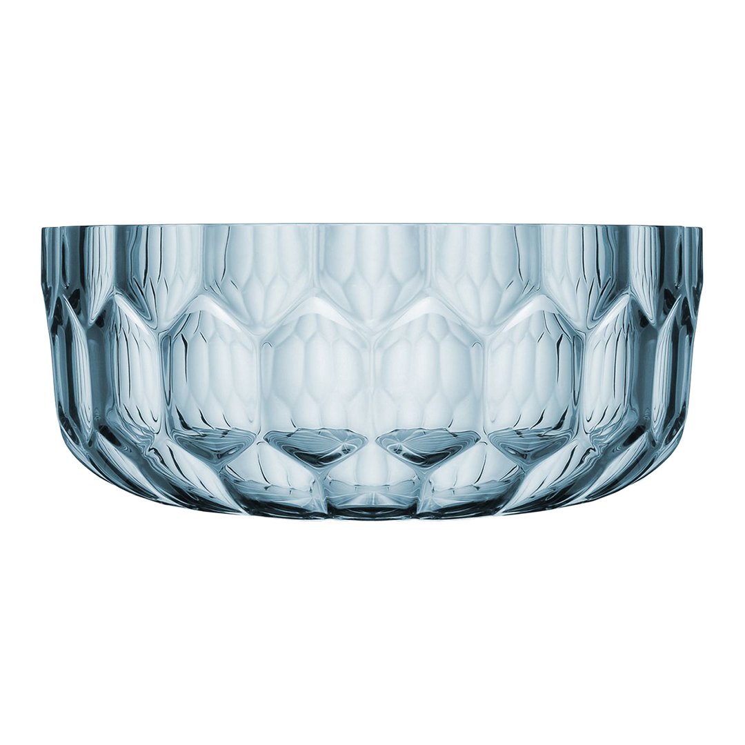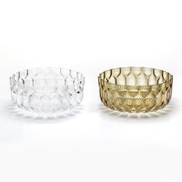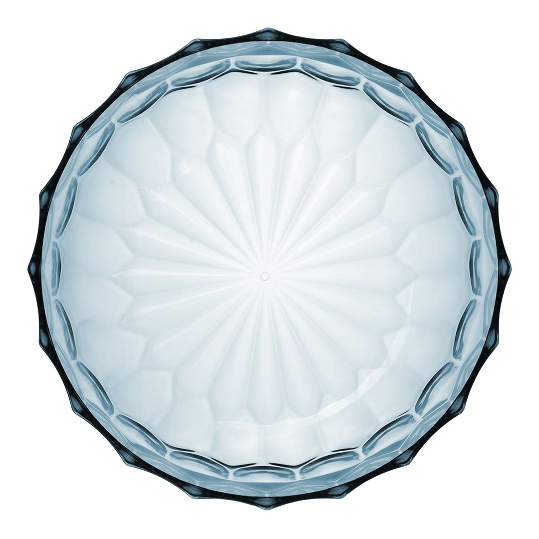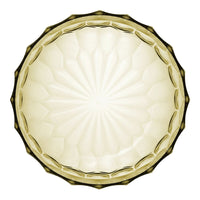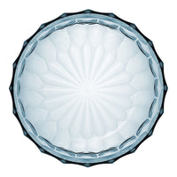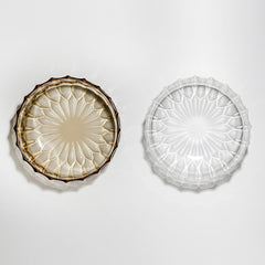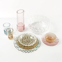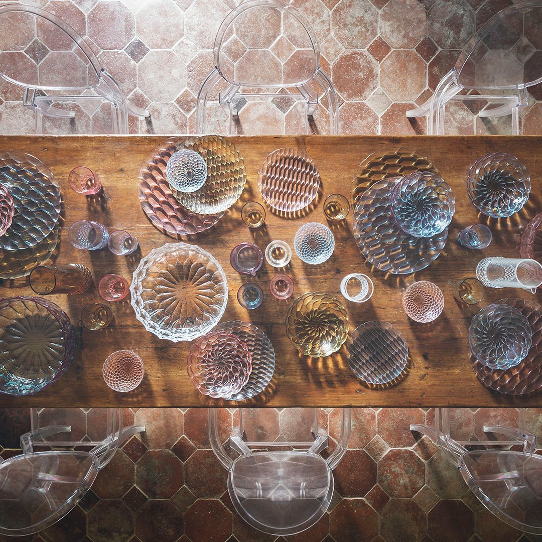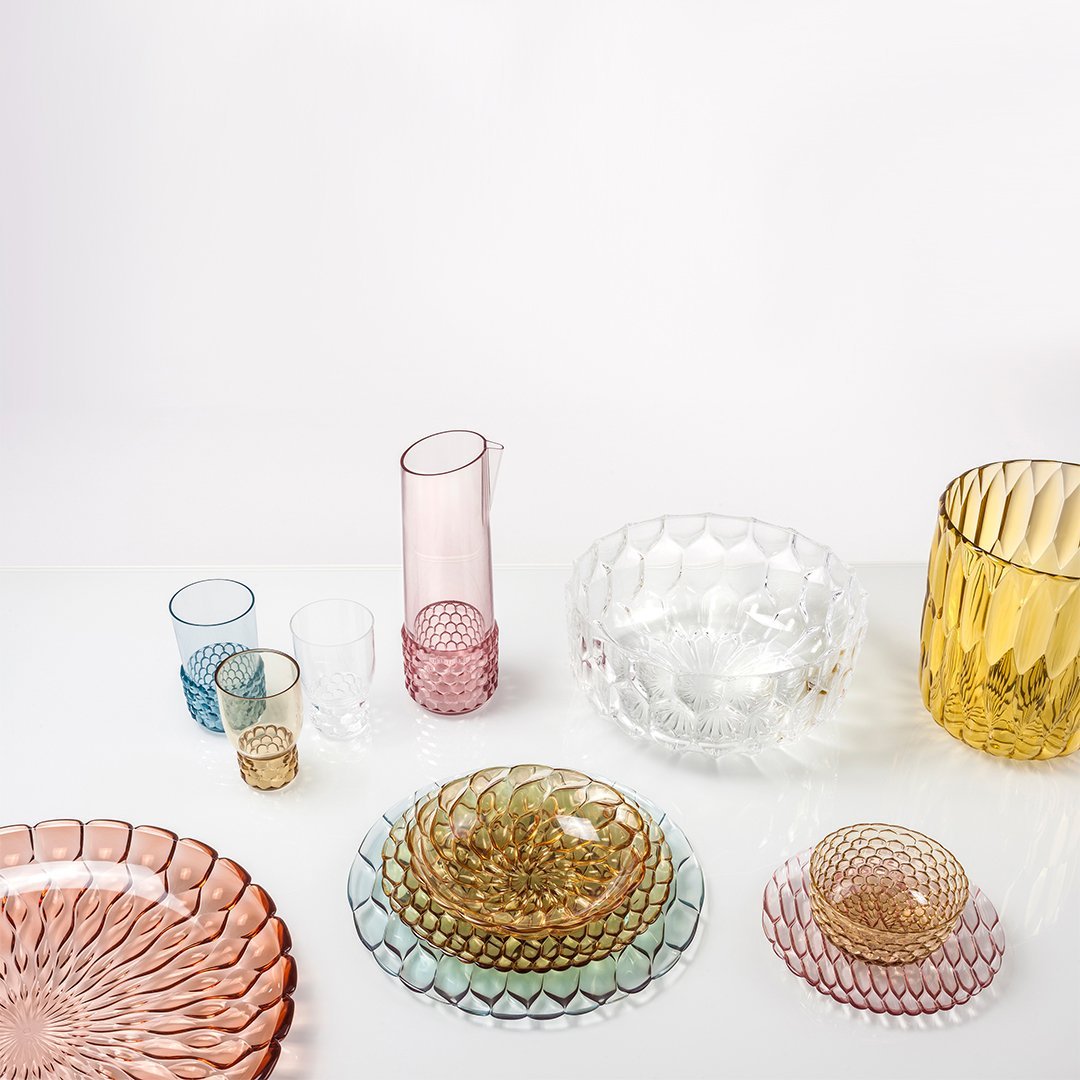 A comprehensive line of plates, trays, glasses, bowls and carafes made from colourful and transparent PMMA plastic. The line's individuality is down to the fact that each model presents a different organic pattern that has clearly been inspired by nature, harking back to the moulds that were once used for making jellies. This design highlights temporality, and therefore also variety, from smallest to largest. The faint, delicate and accessible transparent colours are suitable for furnishing any kind of table: creative and original, or more classic and monochrome.
